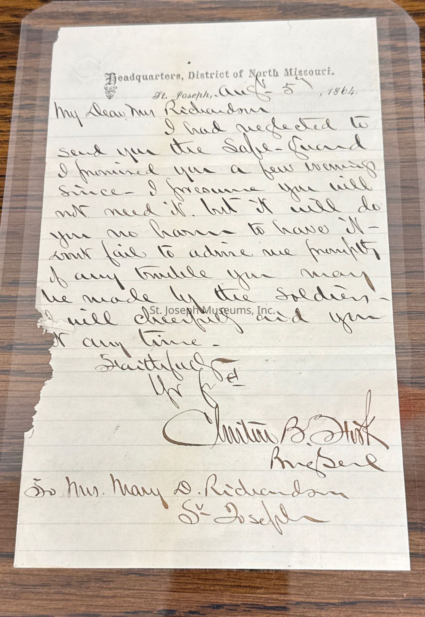 Richardson, Mary, Letter from C. B. Fisk, 1864. Letter to Mary Richardson from C. B. Fisk, dated August 5, 1864, regarding the safe guard that C. B. Fisk forgot to send Mrs. Richardson. Letter on Headquarters, District of North Missouri stationery.