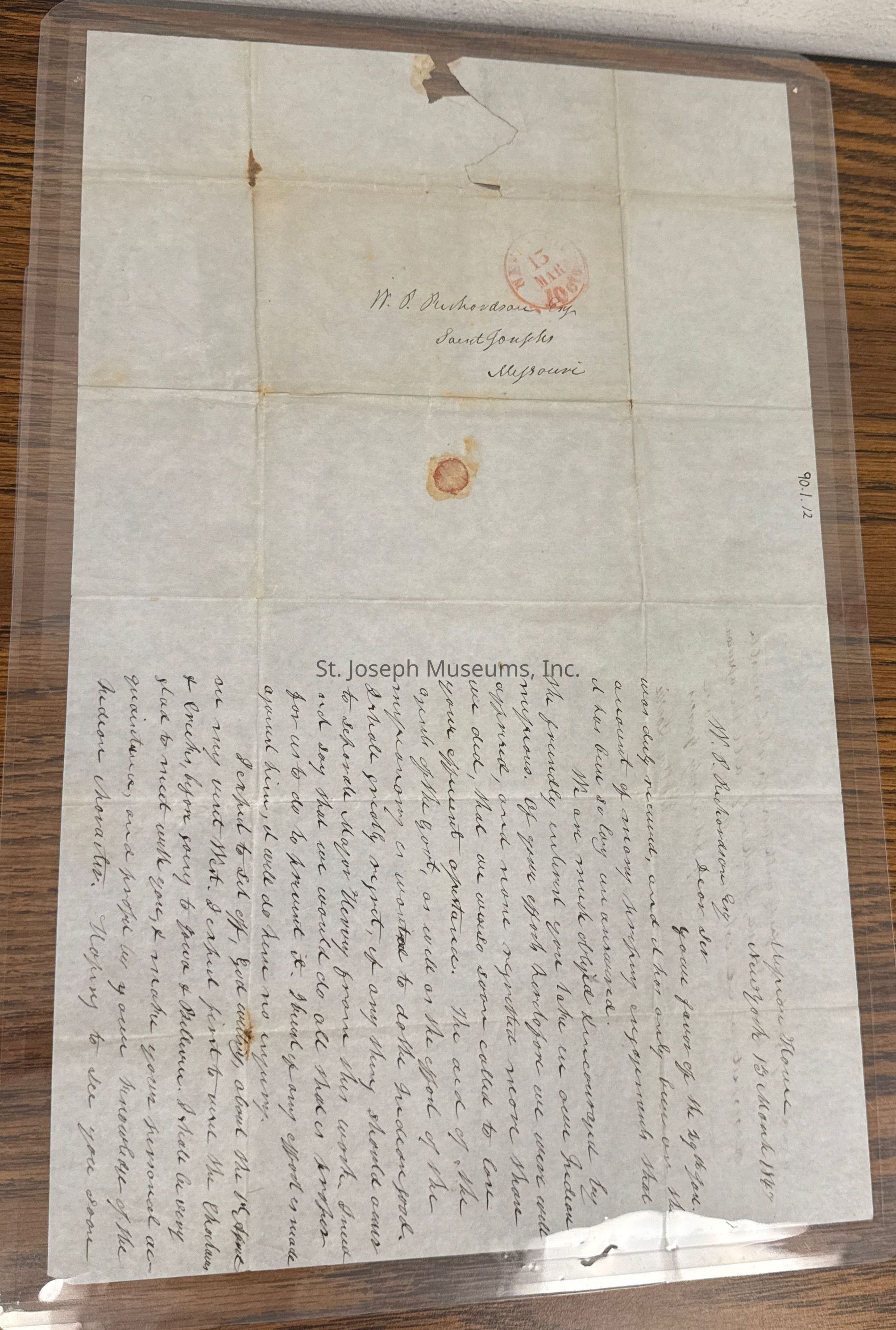 Richardson, W.P. Letter from Walter Lowrie, 1847. Letter from Walter Lowrie to W. P. Richardson, St. Joseph, Mo. dated March 13, 1847. Thanked him for his letter and mentions his trip West. Written from ? House, New York.Lexicon