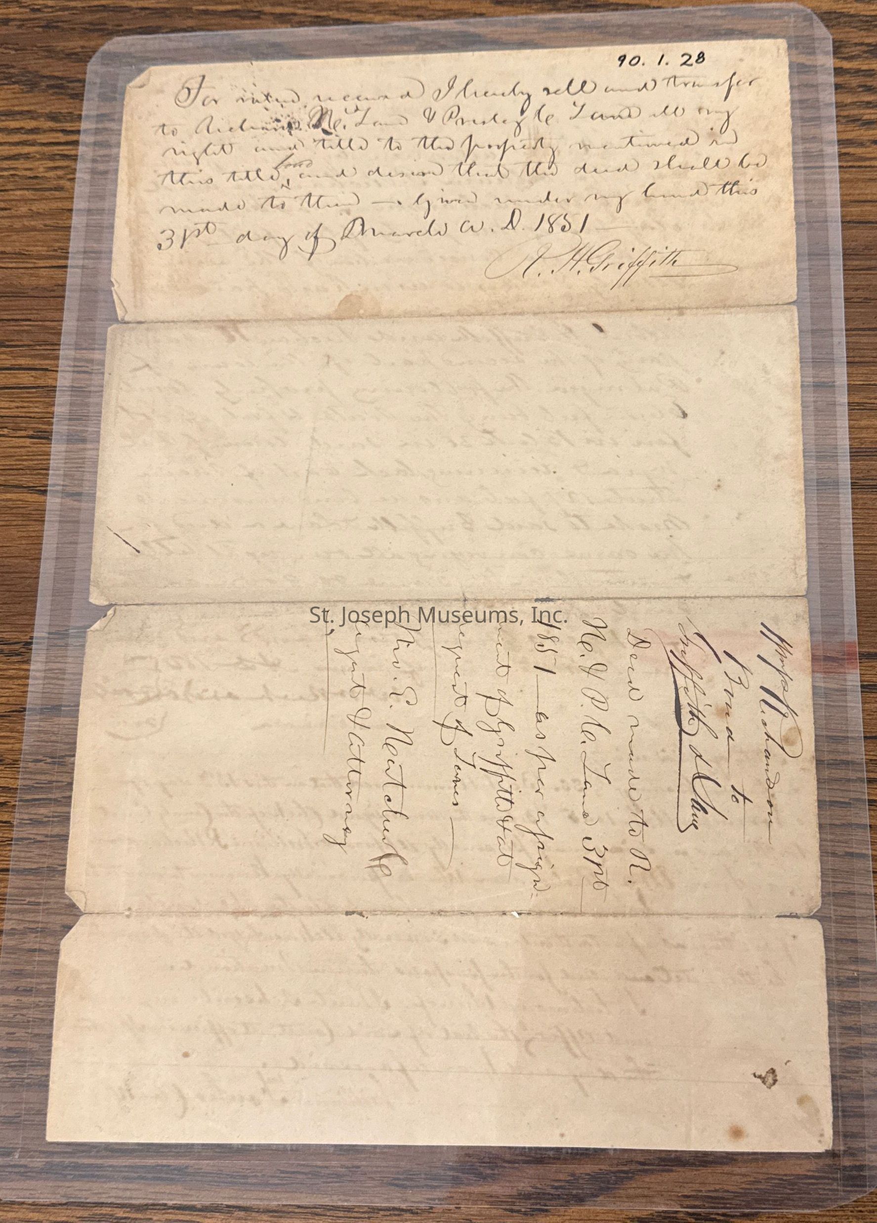 Richardson, William Deed of Lot in Palmyra, 1845. Deed of lot in Palmyra, November 13, 1845. Property in Palmyra sold for $70 from Wm. Richardson and Ann Eliza Richardson of Indian Country to Robert Griffith and Richard Lane. Signed by Wm. Fowler, Clerk. Reverse has resale to Richard Lane, March 31, 1851.Lexicon