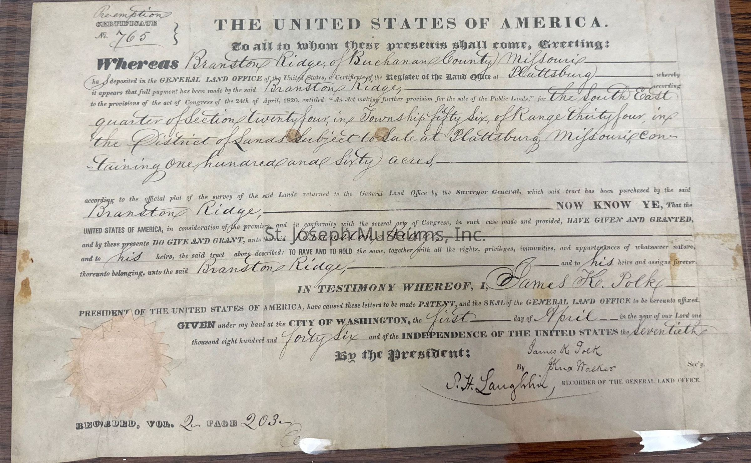 Land Grant Number 765 To Branston Ridge Of Buchanan County for the Southeast quarter of section 24 in township 56 of range 34 containing 160 acres.Dated April 1 1846.Lexicon