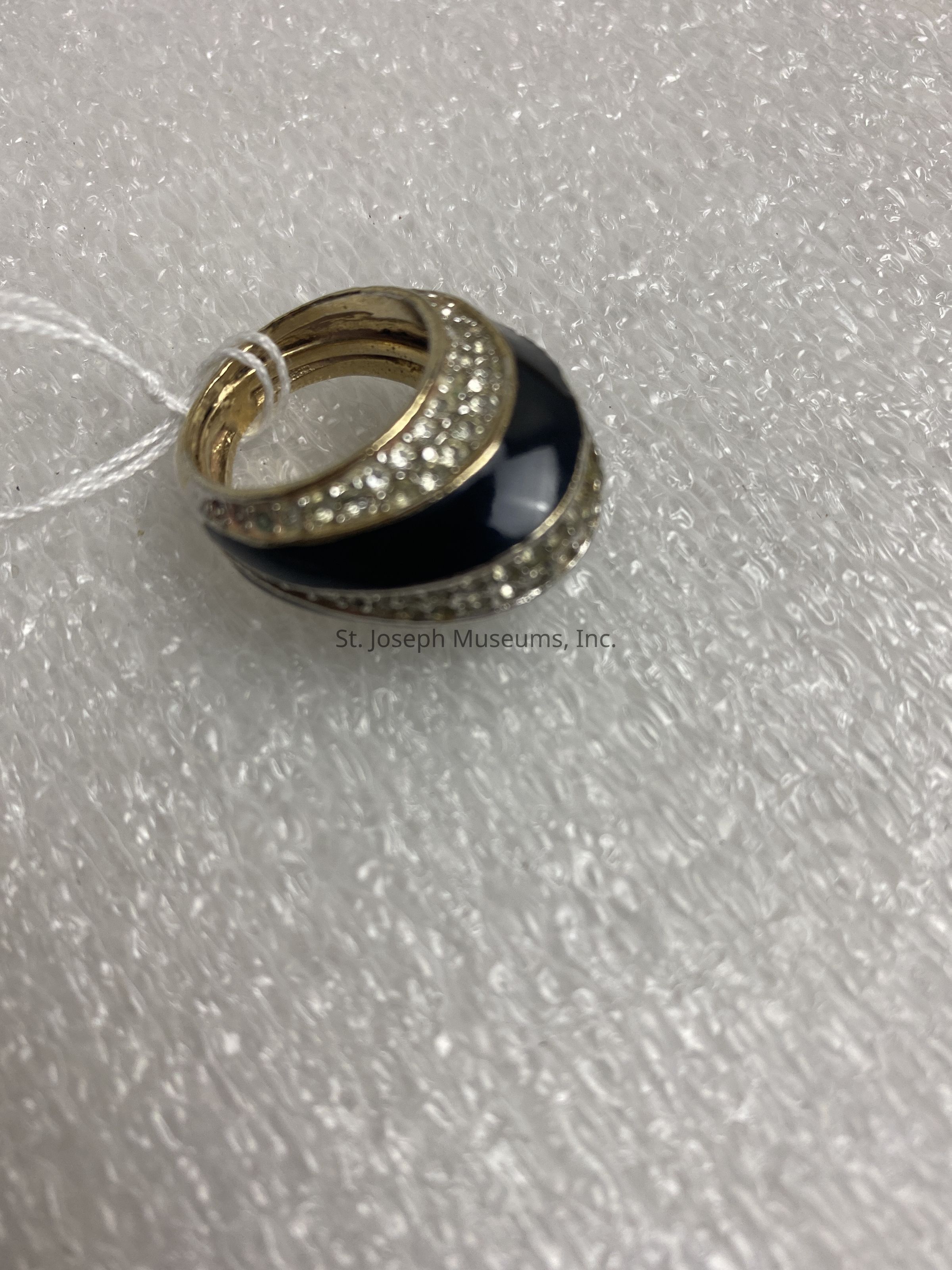 Ring/costume jewelry/gold metal/elliptical shape/row of glass stones down center/a black enamel stripe on each side of the center row/a row of glass stones on each side of the black enamel stripe/ "©Kenneth Lane" stamped on the inside/approximate size 8.