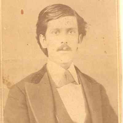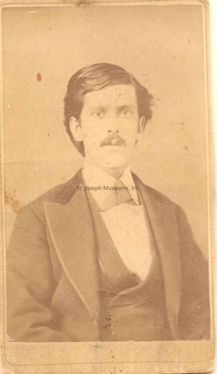 Robidoux Male, Unidentified, Photo, 1879. Sepia photo of man from waist up, wearing vested suit with tie. He has a mustache. "Robidoux" handwritten on back. Photographer. Duer & Cobb - 4th and Edmond St. Joseph, MO