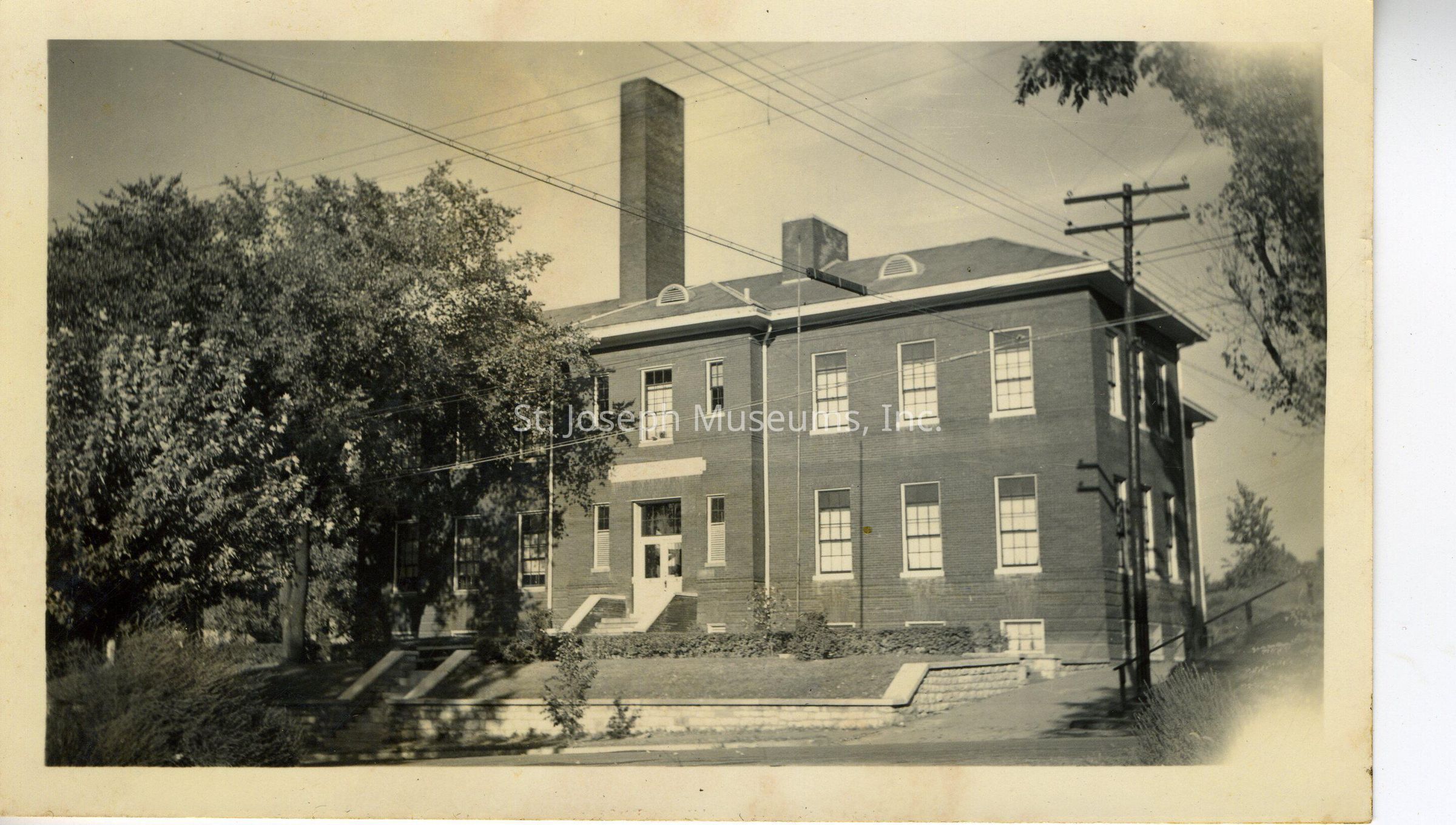 Sherwood Elementary School, 29th & Edmond, Snapshot, 1937, b/w. Front view of school with steps and front lawn, trees to east. film developed by Runner Film, Kansas City, Sept. 27, 1937.