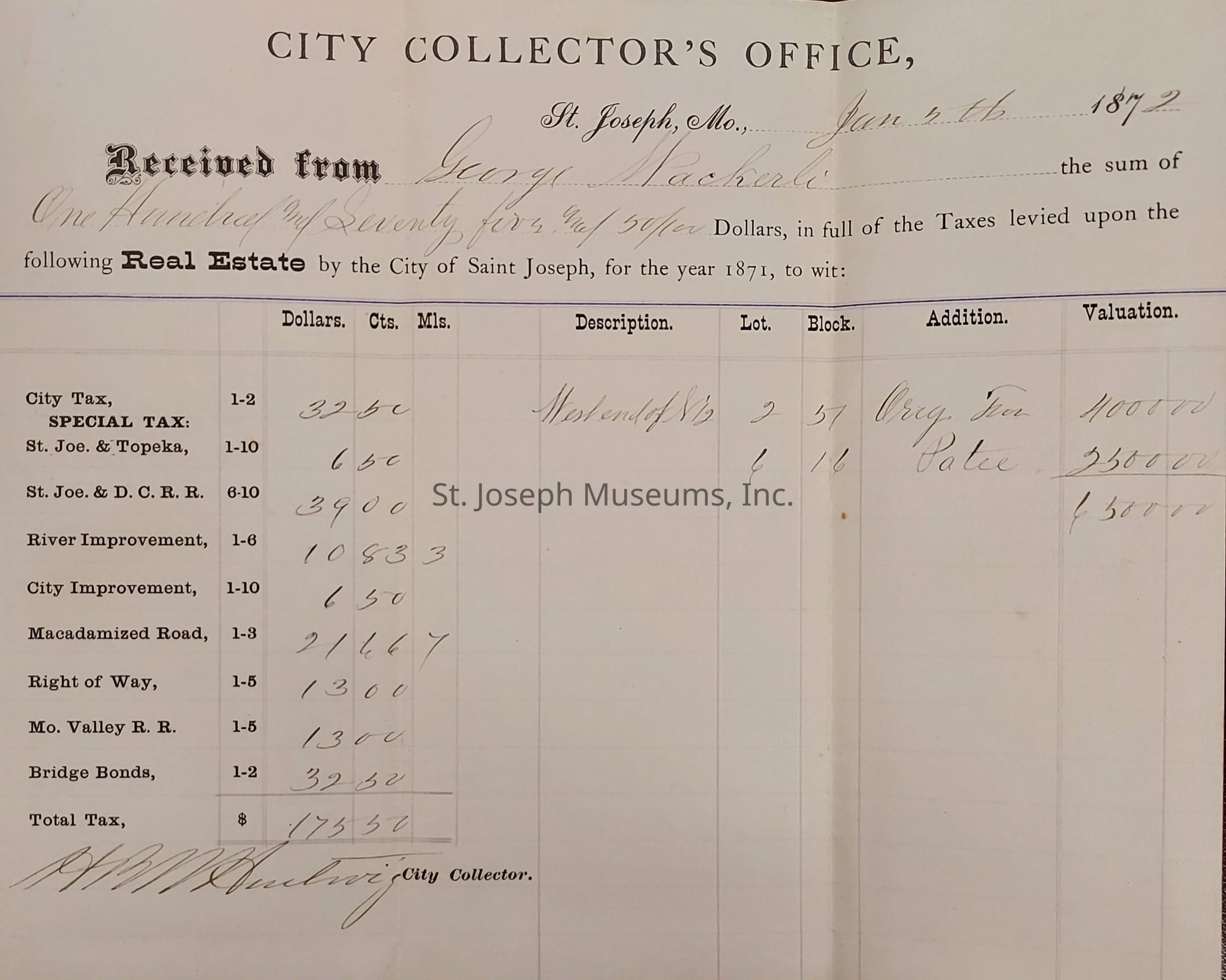 A tri-folded Tax Receipts for George Wackerli. The document is on City Collector's Office, St Joseph, Mo., receipt and signed by (illegible) City Collector. It is dated Jan. 5th, 1872. The upper left hand corner provides the Tax Levy schedule. The middle section of the back side is printed "City Tax Receipt 1900" and includes a NOTICE from the Treasurer.Context