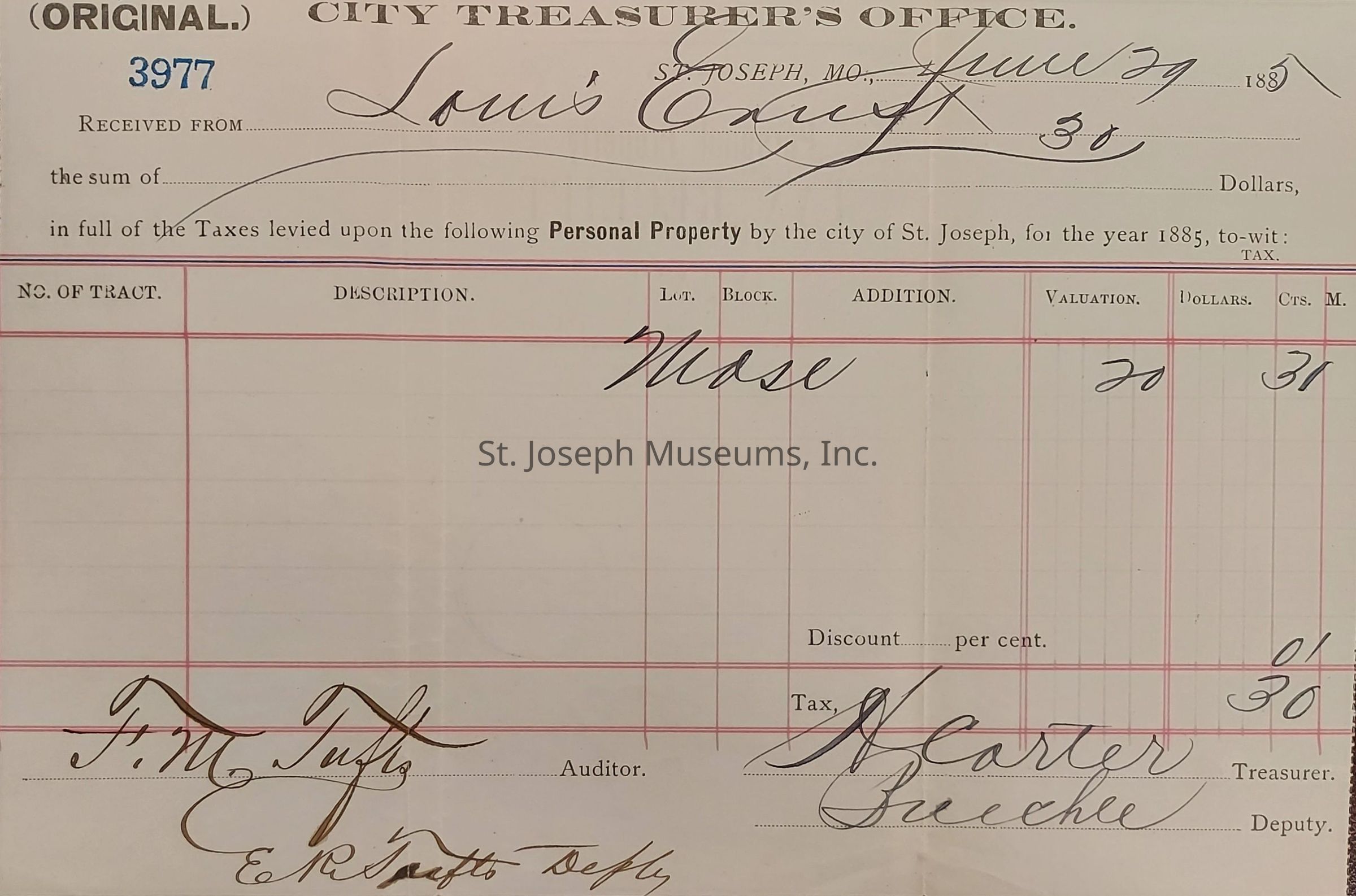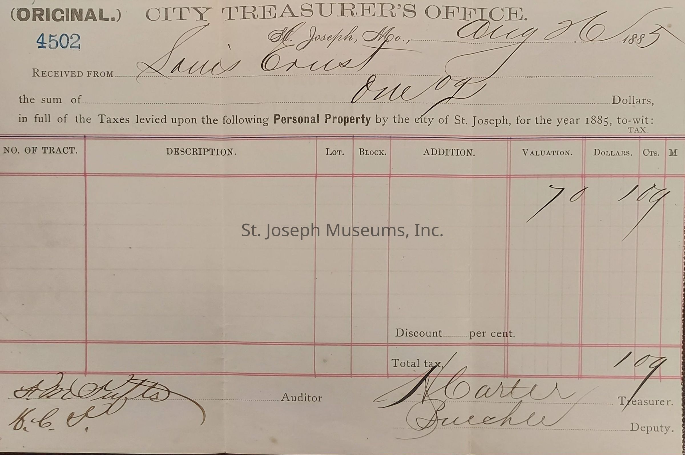 (On the back of the document in the middle section is printed "1885 Personal Property TAX RECEIPT City of St. Joseph, Mo.")Collection