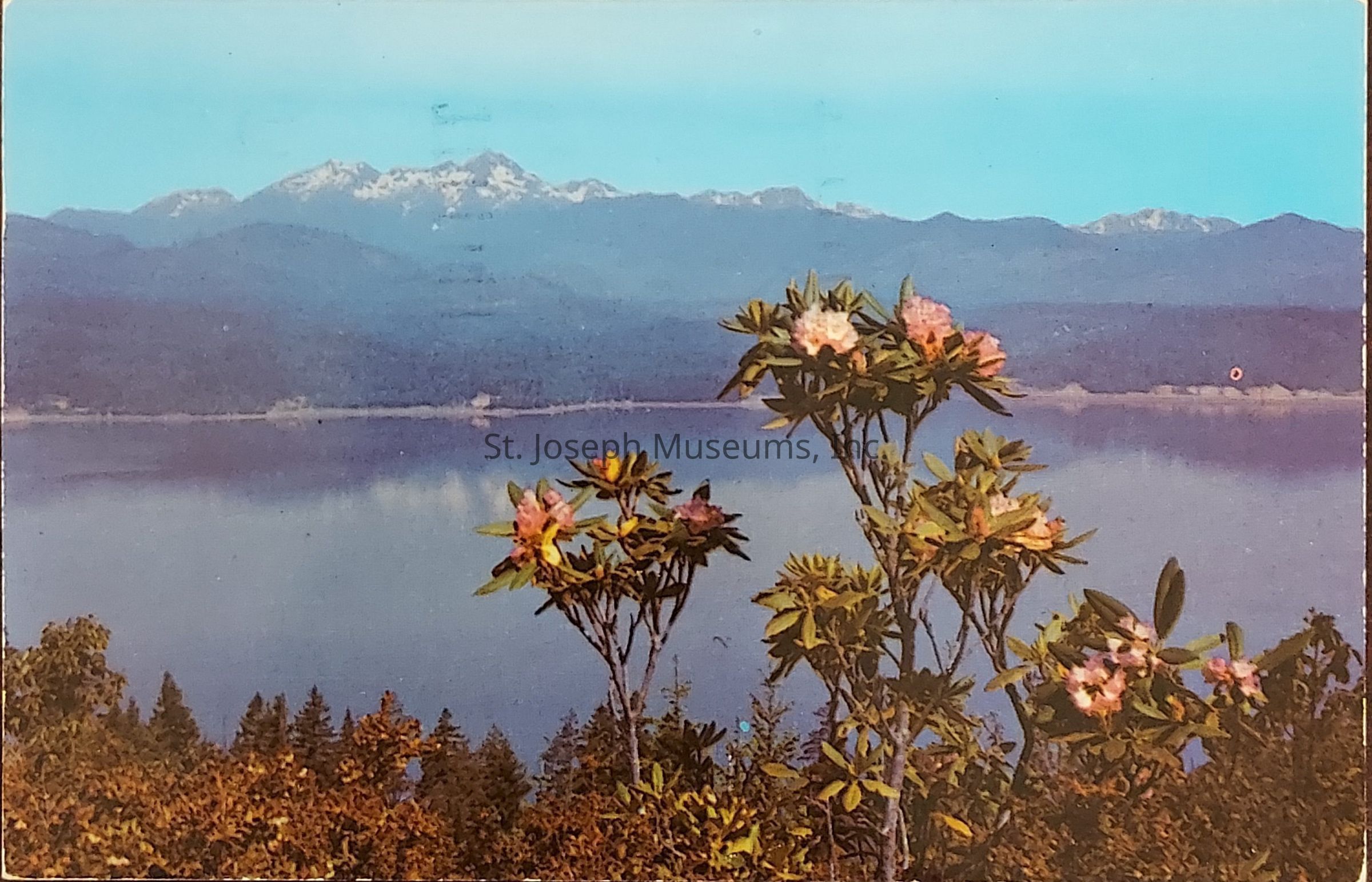 Handwritten postcard from Lela to Mrs R. D. Denicke, #219 N. 21st St., St. Joseph, Mo. Post marked Aug. 13, 1952, Seattle, Wash., 2¢ postage. The front picture is of 'Rhododendrons And Hood Canal. Here an unusual mineral content in the soil causes Washington's official flower to grow in wild profusion. The delicate pink of the blooms stands out against a backdrop formed by the Olympic Mountains and Mt. Washington.'Context
