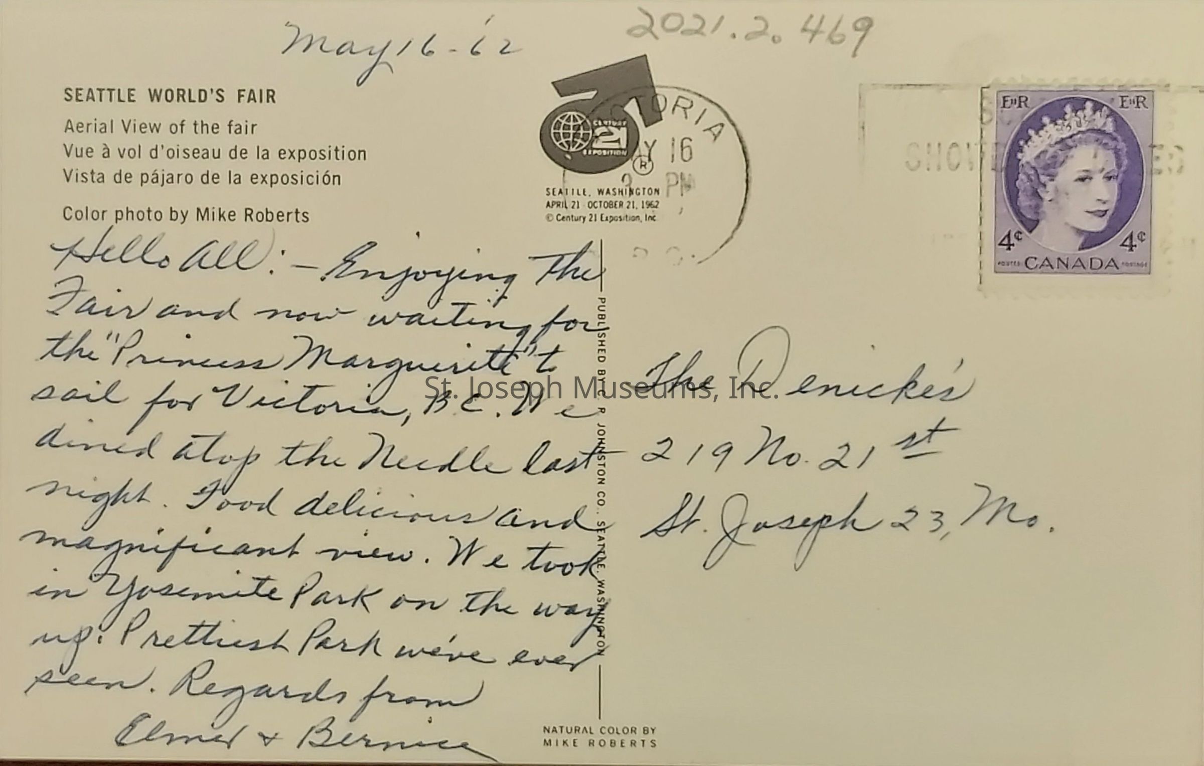 Handwritten postcard, from Elmer & Bernice to The Denickes, 219 North 21st, Saint Joseph. Mo., Postmarked May 16, 1962, Victoria, B. C., postage 4¢ Canadian stamp. The front of the card is a colored picture of the Space Needle at the Seattle World's Fair.