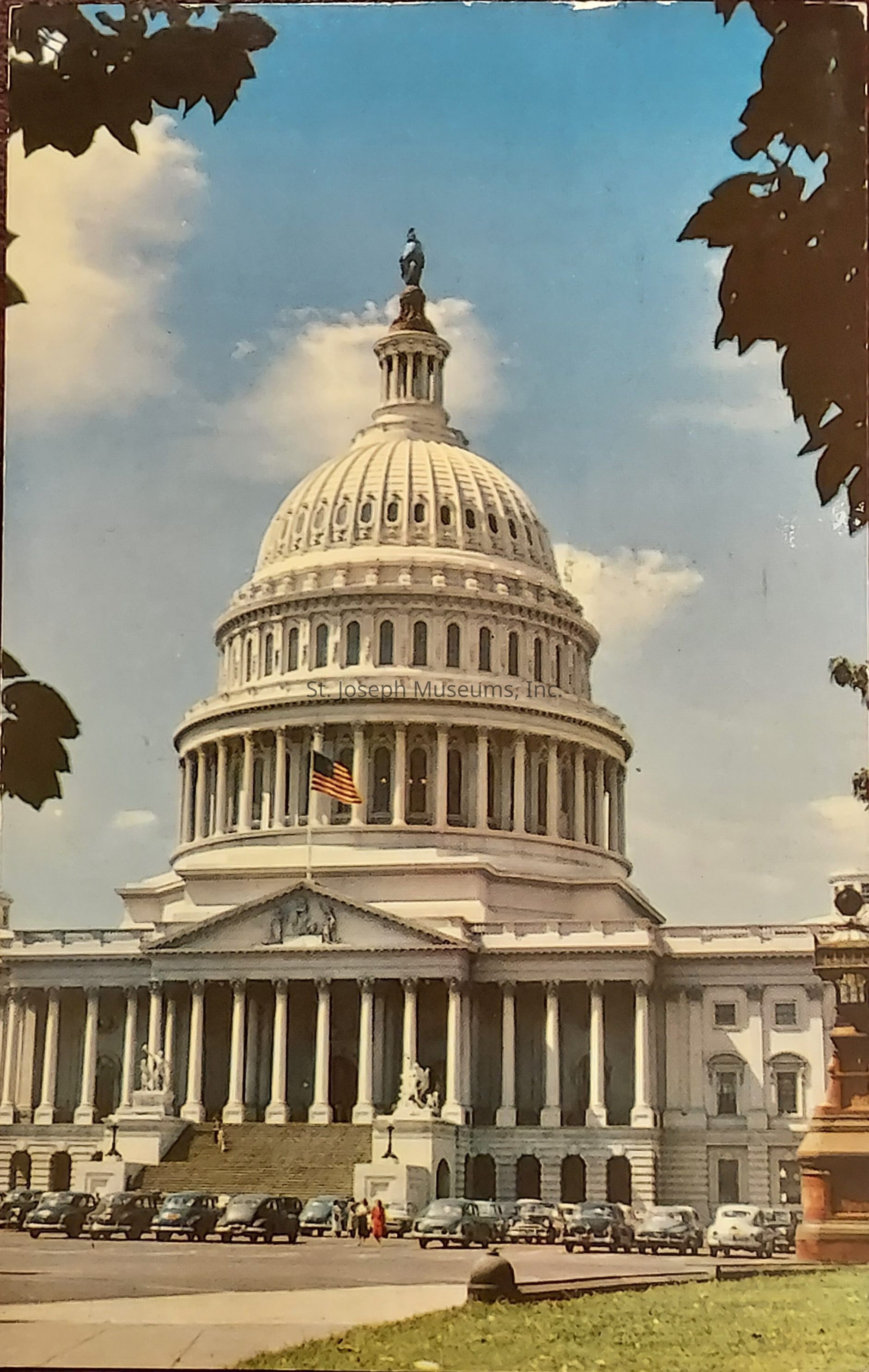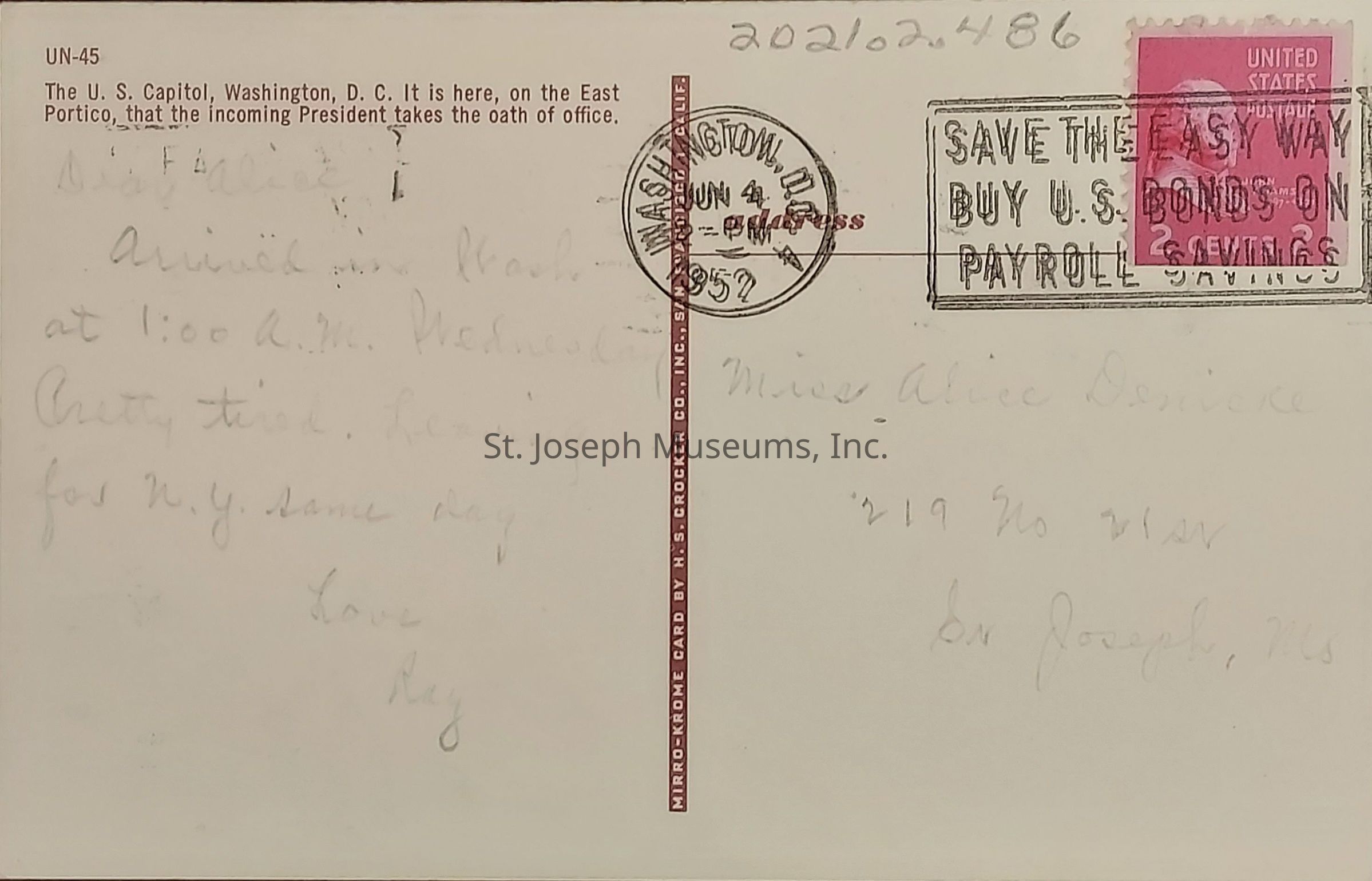 Handwritten postcard, from Ray to Miss Alice Denicke, 219 No 21st., St. Joseph, Mo. Postmarked Jun 4, 1952, Washington, D. C., postage 2¢. The front of the card is a colored photo of The U. S. Capitol, Washington, D. C. World's Only Corn Palace, Mitchell, South Dakota.Context