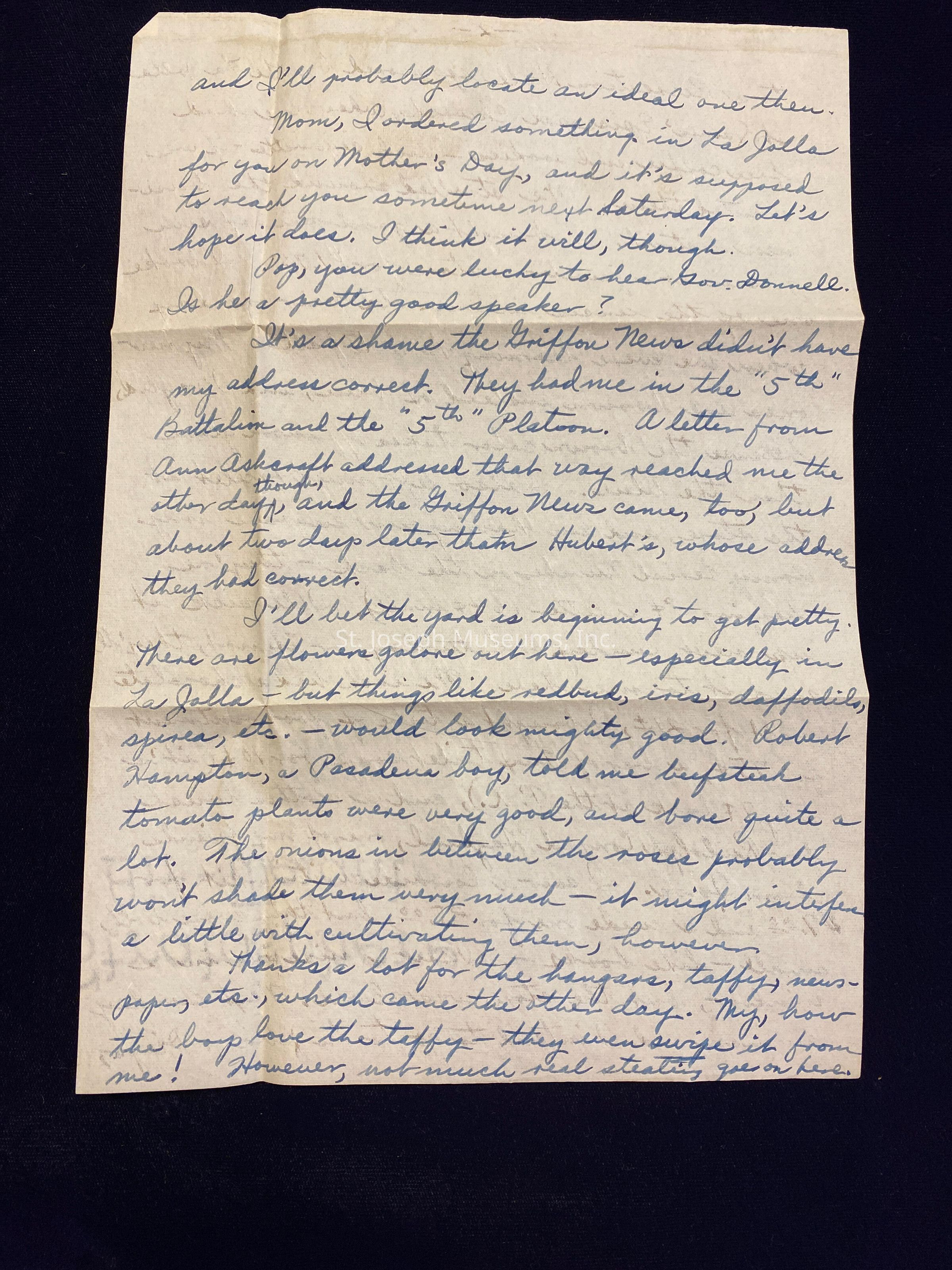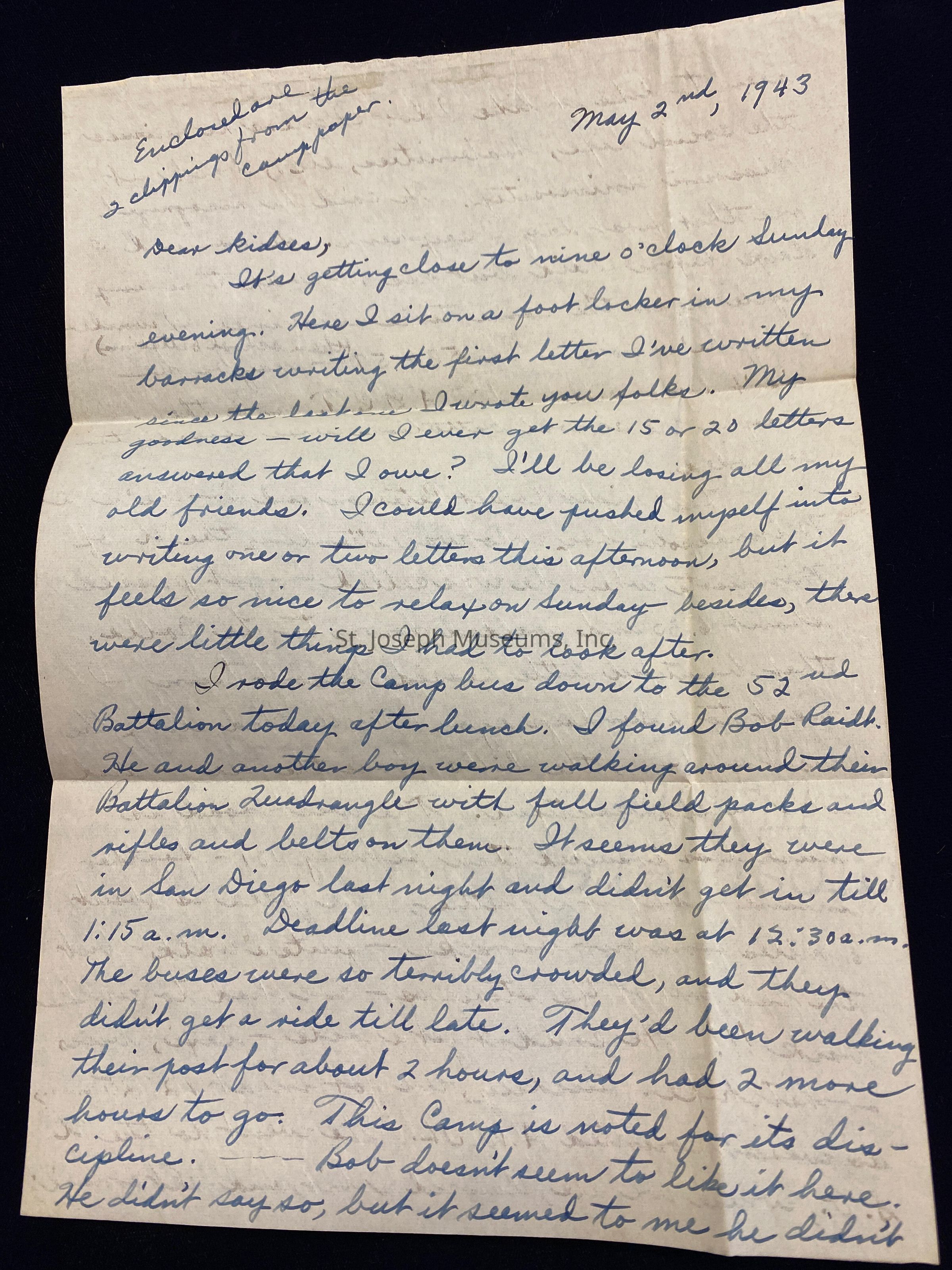 (note in upper left hand corner of page 1: "Enclosed are 2 clippings from the camp paper." These clippings were not included in the envelope) May 2, 1943 Dear Kidses, It's getting close to nine o'clock Sunday evening. Here I sit on the foot locker in my barracks writing the first letter I've written since the last one I wrote you folks. My goodness - will I ever get the 15 or 20 letters answered that I owe? I'll be losing all my old friends. I could have pushed myself into writing one or two letters this afternoon, but it feels so nice to relax on Sunday - besides, there were little things I had to look after. I rode the camp bus down to the 52nd Battalion today after lunch. I found Bob Raidt. He and another boy were walking around their Battalion Quadrangle with full field packs and rifles and belts on them. It seems they were in San Diego last night and didn't get in till 1:15 a.m. Deadline last night was at 12:30 a.m. The buses were so terribly crowded, and they didn't get a ride till late. They'd been walking their post for about 2 hours, and had 2 more hours to go. This Camp is noted for its discipline. ---Bob doesn't seem to like it here. He didn't say so, but it seemed to me he didn't seem to like it like I do. I guess he misses the social life, fraternities, etc., back at Missouri University. He said he recognized me that first day I say him. He arrived 3 days before I did but his 13-week training cycle began the same time as mine. I wonder why he's not in Bn. 53 or 57 (the 2 school Battalions) - maybe he didn't do so well on his A. G. C. T., and then maybe the school battalions were already too crowded. Last night Robert Peterson and I - he's a Minneapolis boy who was attending the U. of Minnesota when he was called - got passes about 6:30 and walked down to La Jolla, that beautiful little seaside resort town I went to 2 Sundays ago. We walked along the west road - on the hills above the sea - and it's really beautiful. The west road is much less traveled than Highway 101 - farther inland - but it's prettier. La Jolla is about 6 miles from our barracks - quite a walk - but the sad part of the story is - we had to walk back!!! We couldn't get a ride - taxi, bus, or hitchike. Luckily, we got in at 12:25 a.m., so weren't counted A.W.O.L. We went to the U.S.O., where we ate, danced a bit, and sat around; to a Recreation Hall sponsored by the La Jolla St. James' Episcopal Church, where we had free coffee and cookies - and cigarettes - if we wanted them. We strolled around the business district. I bought a good pair of sun glasses at a jeweler's store for $1.75. I broke one of the lenses in my old pair one day when we were learning how to fall. My new ones are brown instead of blue, and I'm glad, because the brown color takes off more glare than the blue. I also left my bracelet at the store, and am having 'em engrave my Army Serial Number on the back - they're charging 8 cents a letter (64 cents in all). I'll pick it up next Sunday or Saturday, or if not, thay'll send it to me here. We each had a chocolate malt for 21 cents, I bought a tube of foot ointment for 75 cents, a bar of Lux toilet soap for 10 cents (it's only 7 cents back at the P.X.), and a clothes brush for Rudolph Conrad Haglund, one of my friends from Iowa. I saw a cowhide writing kit for $7.00 and a suede one for $5.00, but they were both small - like books -. I saw a nice big one in a window, but the store was closed. Next Sunday Swanson and I intend to go to La Jolla or Diego, and I'll probably locate an ideal one then. Mom, I ordered something in La Jolla for you on Mother's Day, and it's supposed to reach you sometime next Saturday. Let's hope it does. I think it will, though. Pop, you were lucky to hear Gov. Donnell. Is he a pretty good speaker? It's a shame the Griffon News didn't have my address correct. They had me in the "5th" Battalion and the "5th" Platoon. A letter from Ann Ashcroft addressed that way reached me the other day though, and the Griffon News came, too, but about two days later than Hubert's, whose address they had correct. I bet the yard is beginning to get pretty. There are flowers galore out here - especially in La Jolla - but things like redbud, iris, daffodils, spirea, etc. - would look mighty good. Robert Hampton, a Pasadena boy, told me beefsteak tomato plants were very good, and bare quite a lot. The onions in between the roses probably won't shade them very much - it might interfere a little with cultivating them, however. Thanks a lot for the hangars, taffy, newspapers, etc. which came the other day. My, how the boys love the taffy - they even swipe it from me! However, not much real stealing goes on here. I finally got around to reading last Sunday's News-Press. That speech must have been a lot of work - but interesting, though. I had a fairly nice letter from Uncle Robert yesterday - written in ink too. Of course he had to "bitch" (army slang for "gripe") a bit about the Army, but I expected that. I certainly hope I find time to answer his letter. Folks, I think I have a very good chance for the Army Specialized Training Program. I've enclosed the second article explaining it which appeared in last Friday's "Range Finder" - camp newspaper. When we filled out the three duplicate forms the other day, we rated the 4 large branches in the order of our preferences. Foreign Service (comes under the heading "Languages, " also) sounds by far the most interesting and exciting, doesn't it? I believe I have an extremely good chance for it, having had a 2-yr. Liberal Arts course and being able to read, write, and speak Spanish. The Psychology Division, a relatively small one, would probably be very good, too, and the Army might want to place me there, since I had a course in high school and two courses of it in college. Most of the fellows who are eligible (1 out of 5 who took the A. S. T. P. test passed it) haven't had that much psychology nor can many of them speak a modern foreign language, s