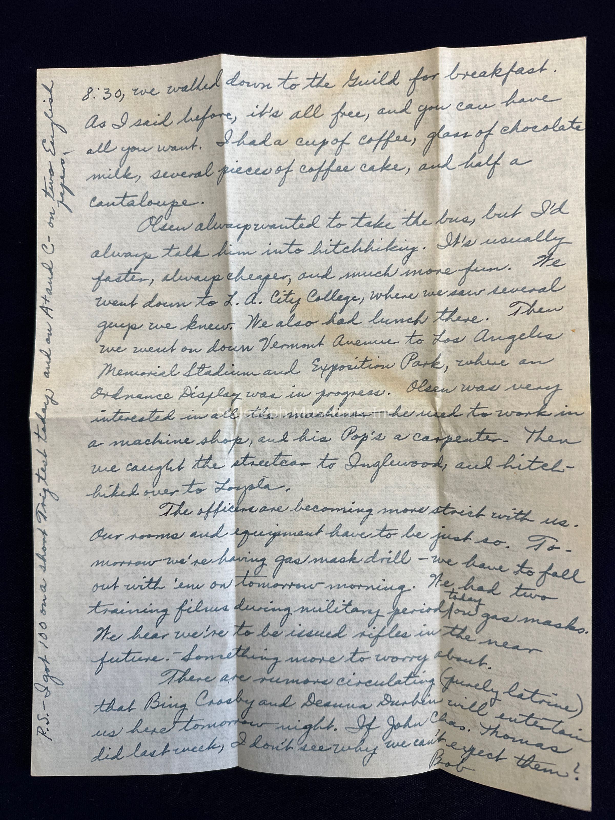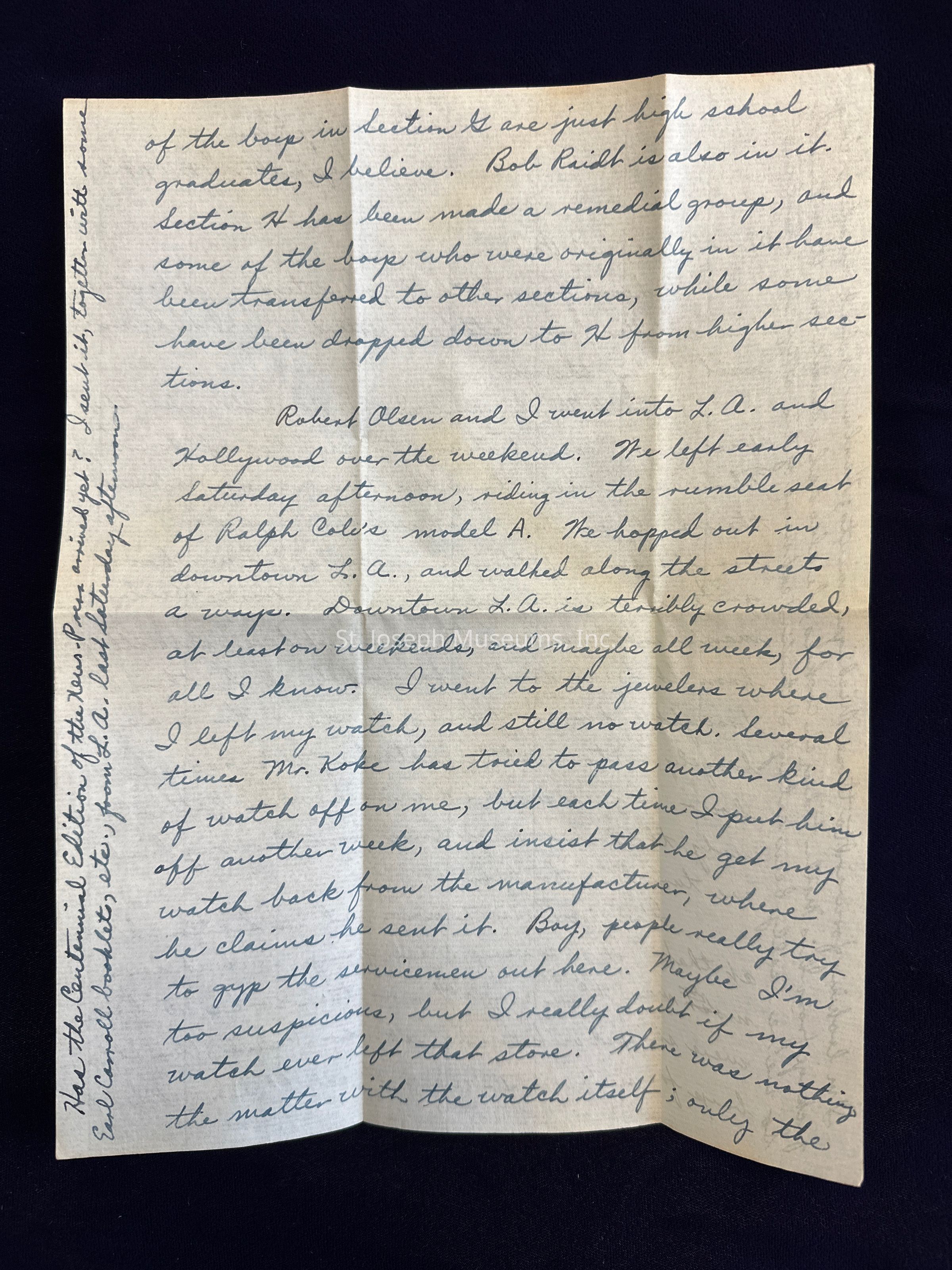 Robert Olsen and I went into L.A. and Hollywood over the weekend. We left early Saturday afternoon, riding in the rumble seat of Ralph Cole's model A. We hopped out in downtown L.A. and walked along the streets a ways. Downtown L.A. is terribly crowded, at least on weekends, and maybe all week, for all I know. I went to the jewelers where I left my watch, and still no watch. Several times Mr. Koke has tried to pass another kind of watch off on me, but each time I put him off another week, and insist that he get my watch back from the manufacturer, where he claims he sent it. Boy, people really try to gyp the servicemen out here. Maybe I'm too suspicious, but I really doubt if my watch ever left that store. There was nothing the matter with the watch itself; only the frame was cracked. But I shouldn't have turned the entire watch in in the first place.