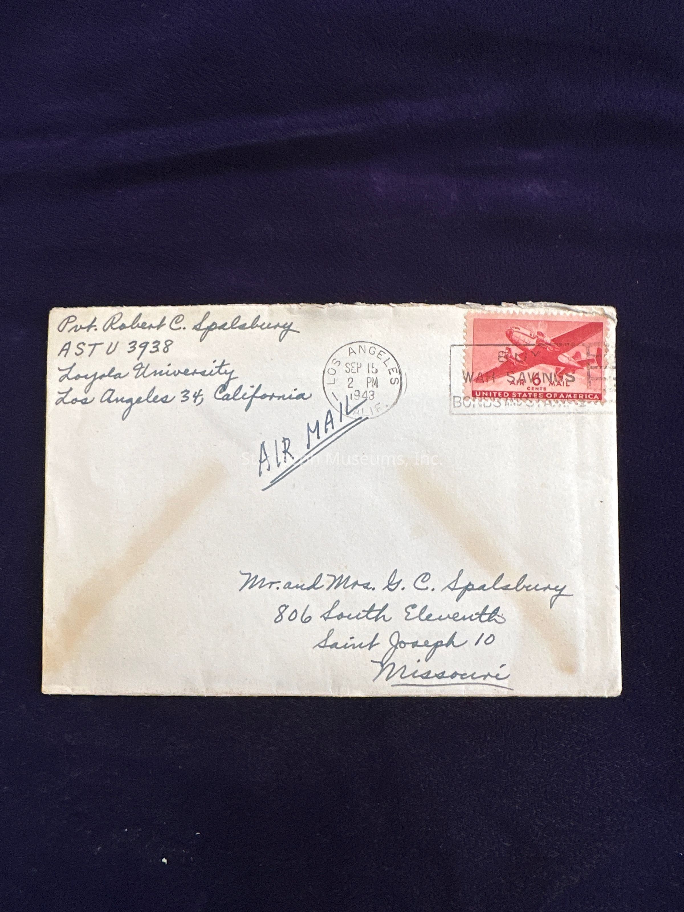 Letter Home from Pvt. Robert C. Spalsbury, ASTU 3938, Loyola University, Los Angeles 34, California to his parents Mr. and Mrs. G. C. Spalsbury, 806 South Eleventh, Saint Joseph 10, Missouri. Post Marked SEPT 15, 1943, 2 PM, Los Angeles, Calif., 6 cent Air Mail stamp.Description