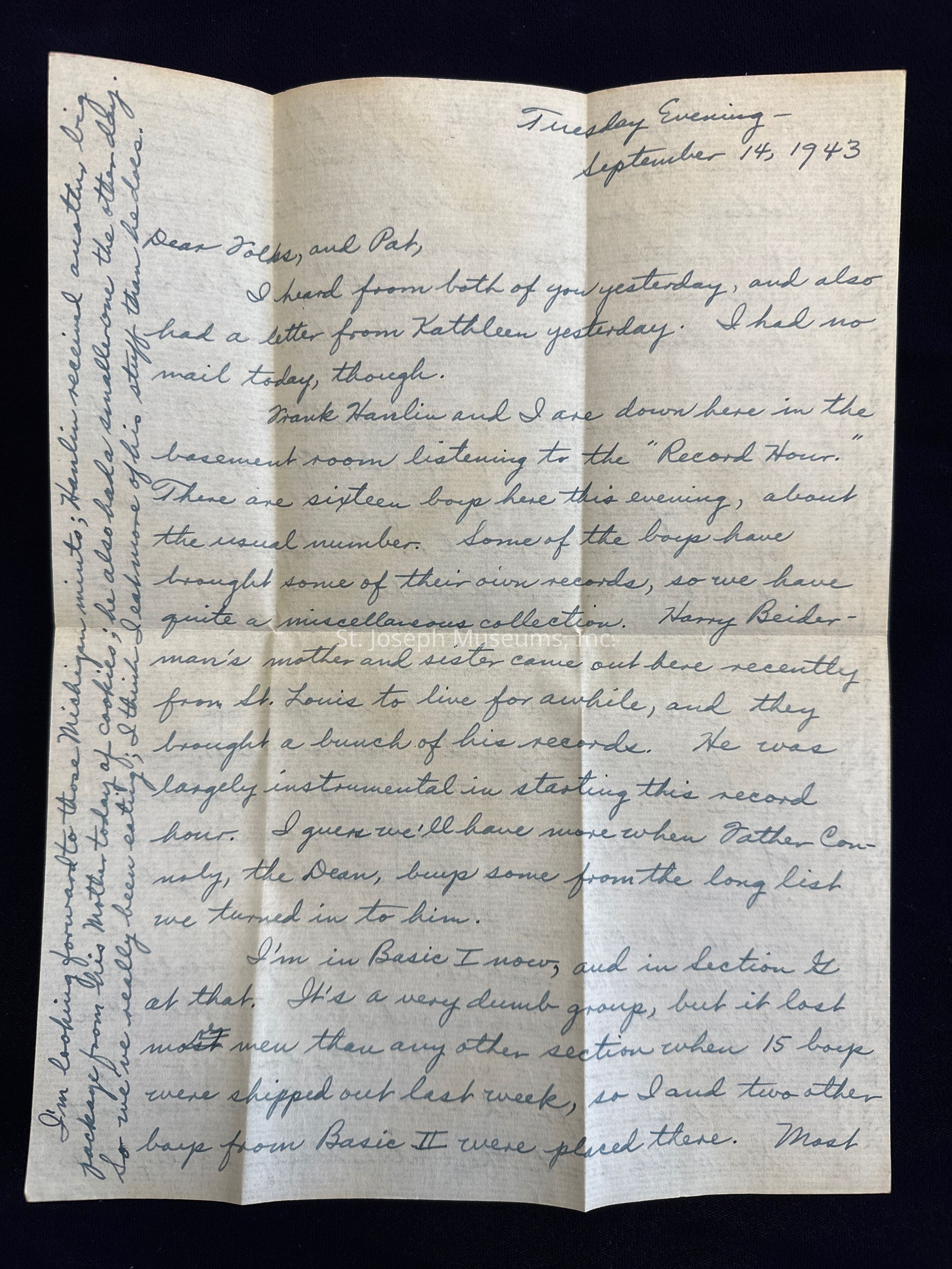 Handwritten letter home to parents back in St. Joseph after being called up to serve in the US Army during WWII. Pvt. Spalsbury, at the time of this letter, has completed Basic Training at Camp Callan, California, was stationed for a short time with a STAR Unit for ASTP (Army Specialized Training Program) soldiers in Pasadena, CA and is now stationed at Loyola University in Los Angeles, CA for additional training.