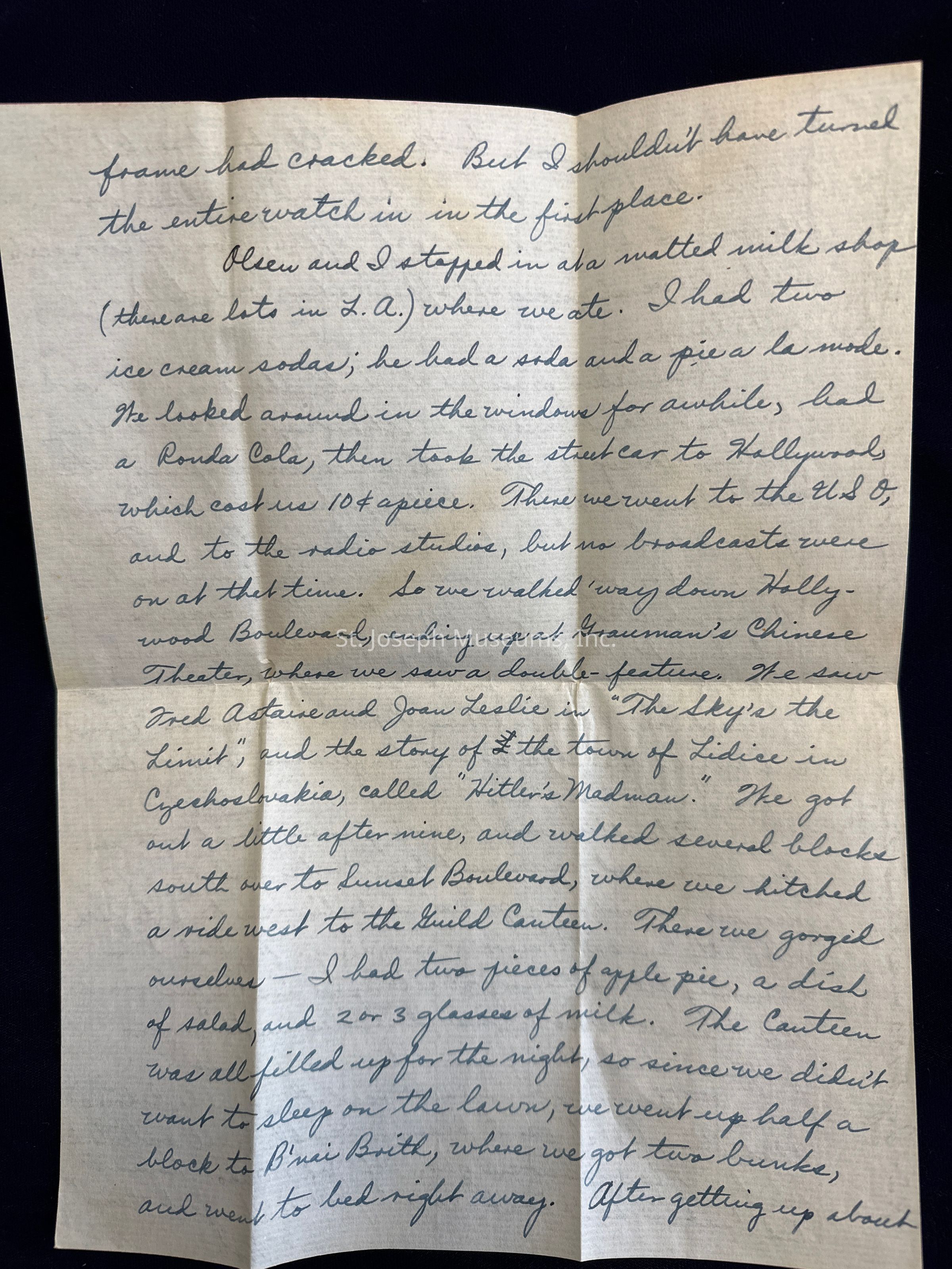 Olsen and I stopped in at a malted milk shop (there are lots in L.A.) where we ate. I had two ice cream sodas; he had a soda and a pie a la mode. We looked around in the windows for awhile, had a Ronda Cola, then took the street car to Hollywood, which cost us 10 cents apiece. There we went to the USO, and to the radio studios, but no broadcasts were on at that time. So we walked 'way down Hollywood Boulevard, ending up at Grauman's Chinese Theater, where we saw a double-feature. We saw Fred Astaire and Joan Leslie in "The Sky's the Limit," and the story of the town of Lidice in Czechoslovakia, called "Hitler's Madman." We got out a little after nine, and walked several blocks south over to Sunset Boulevard, where we hitched a ride west to the Guild Canteen. There we gorged ourselves - I had two pieces of apple pie, a dish of salad, and 2 or 3 glasses of milk. The Canteen was all filled up for the night, so since we didn't want to sleep on the lawn, we went up half a block to B'nai Brith, where we got two bunks and went to bed right away. After getting up about 8:30, we walked down to the Guild for breakfast. As I said before, it's all free, and you can have all you want. I had a cup of coffee, glass of chocolate milk, several pieces of coffee cake, and half a cantaloupe.
