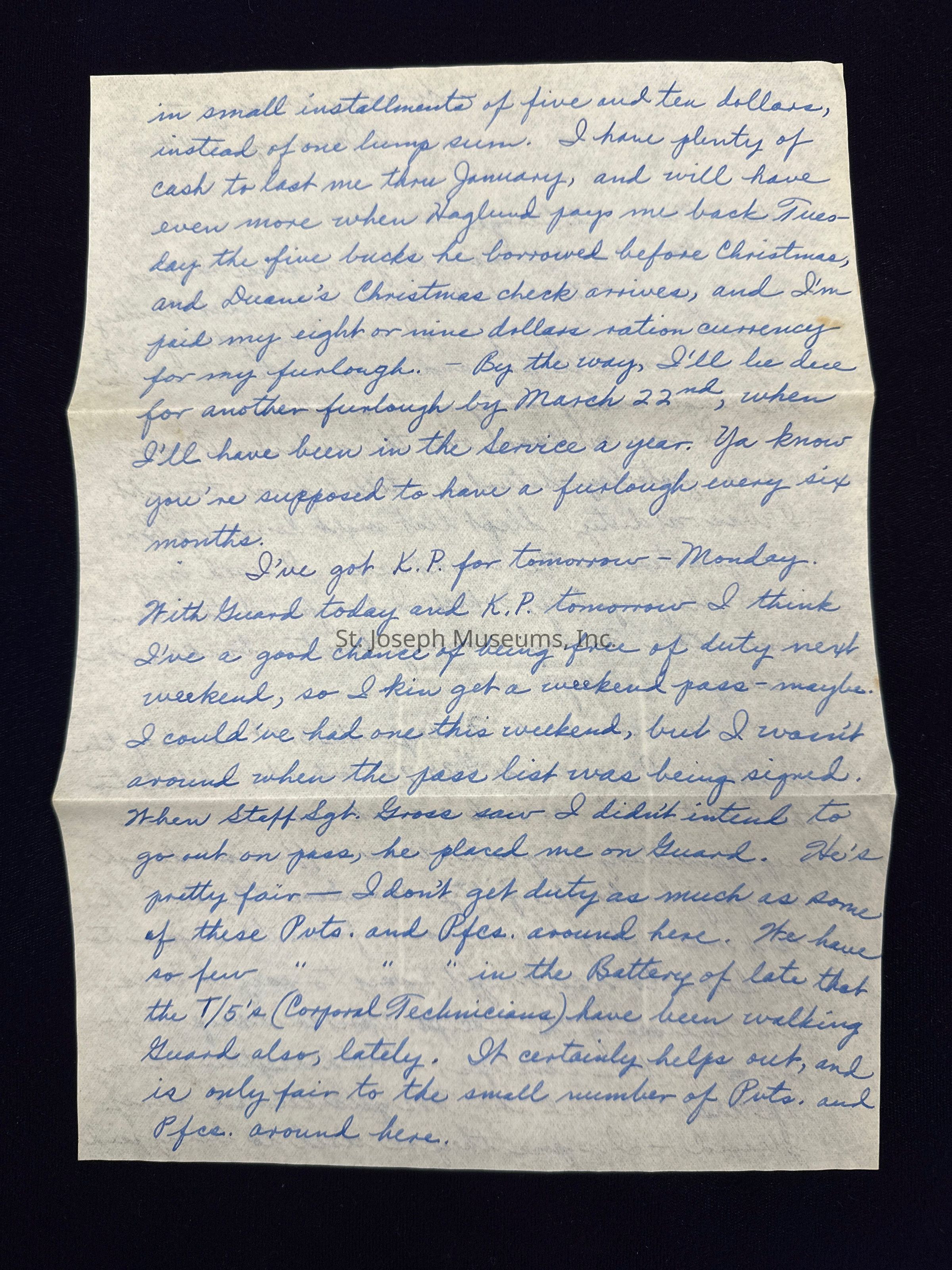 I've got K.P. for tomorrow - Monday. With Guard today and K.P. tomorrow I think I've a good chance of being free of duty next weekend, so I kin get a weekend pass - maybe. I could've had one this weekend, but I wasn't around when the pass list was being signed. When Staff Sgt. Gross saw I didn't intend to go out on pass, he placed me on Guard. He's pretty fair - I don't get duty as much as some of these Pvts. and Pfcs. around here. We have so few Pvts. and Pfcs. in the Battery of late that the T/5's (Corporal Technicians) have been walking Guard also, lately. It certainly helps out, and is only fair to the small number of Pvts. and Pfcs. around here.