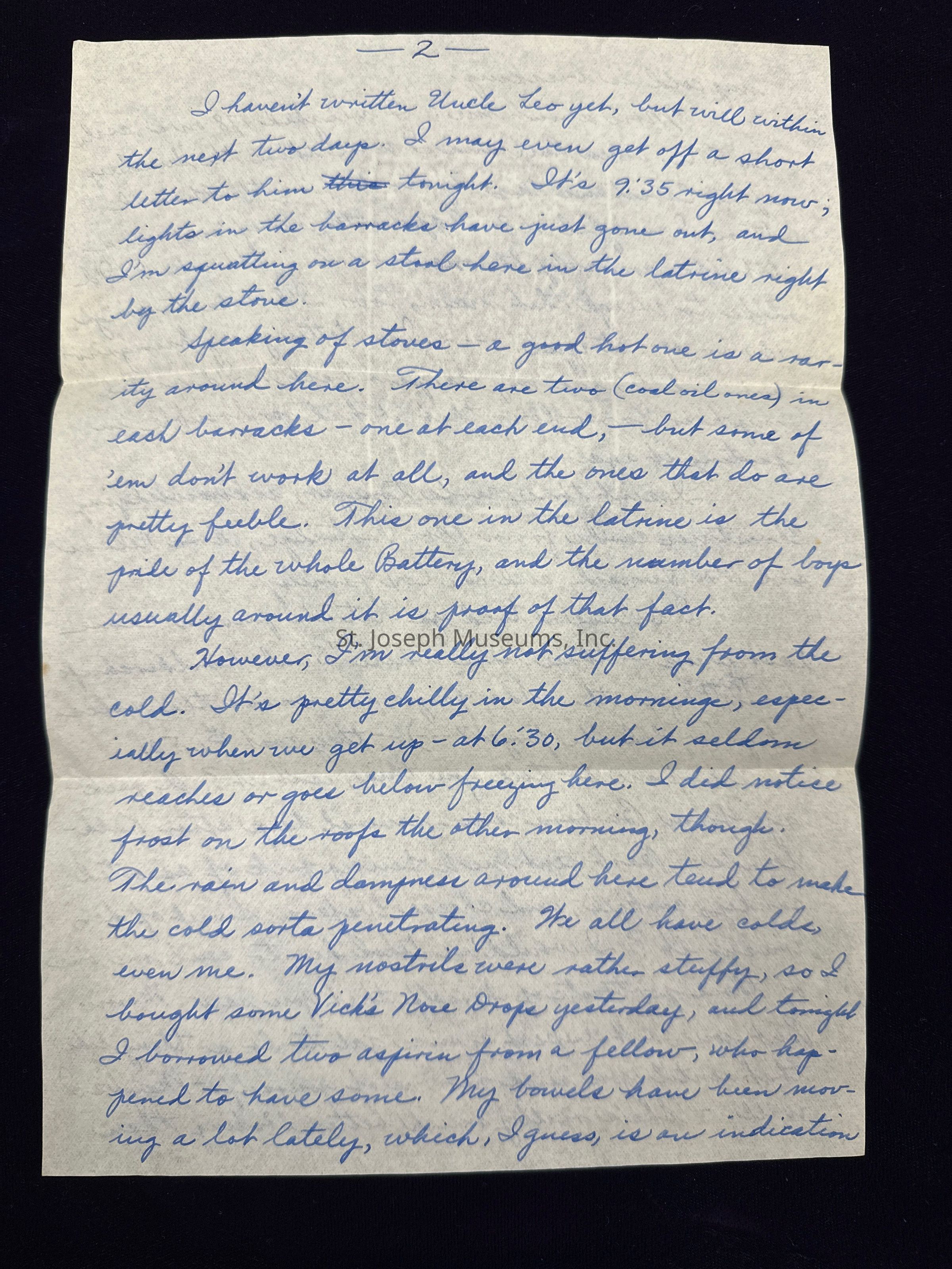 I haven't written Uncle Leo yet, but will within the next two days. I may even get off a short letter to him tonight. It's 9:35 right now, lights in the barracks have just gone out, and I'm squatting on a stool here in the latrine right by the stove.