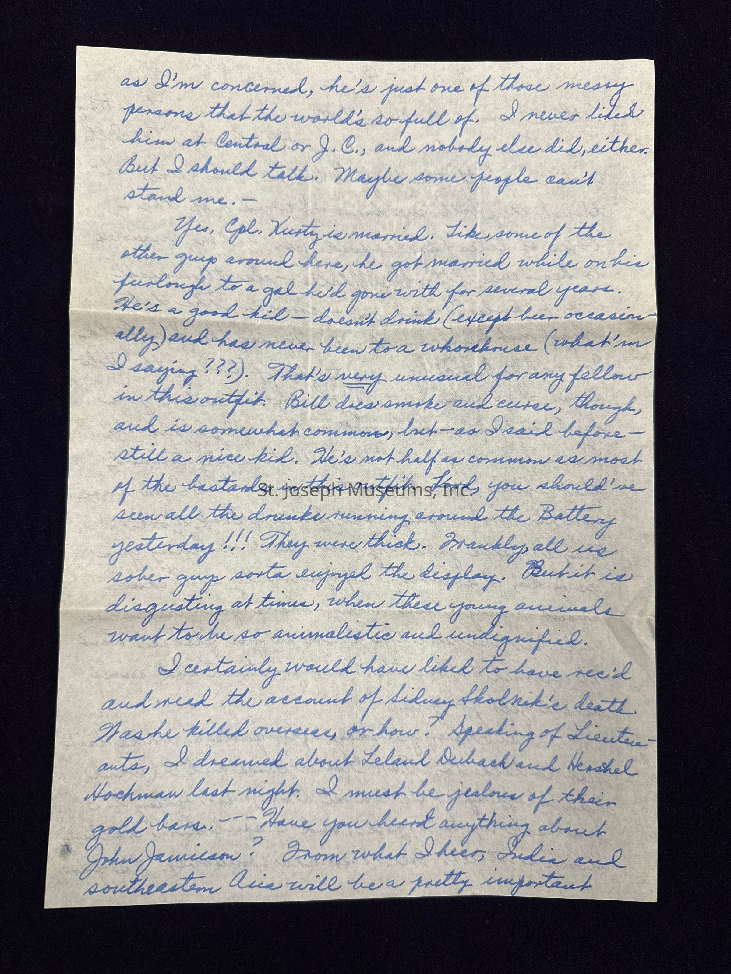 Yes, Cpt. Kurtz is married. Like some of the other guys around here, he got married while on his furlough to a gal he'd gone with for several years. He's a good kid - doesn't drink (except beer occasionally) and has never been to a whorehouse (what 'm I saying ???). That's very unusual for any fellow in this outfit. Bill does smoke and curse, though, and is somewhat common, but - as I said before - still a nice kid. He's not half as common as most of the bastards in this outfit. Lord, you should've seen all the drunks running around the Battery yesterday!!! They were thick. Frankly, all us sober guys sorta enjoyed the display. But it is disgusting at times, when these young animals want to be so animalistic and undignified.