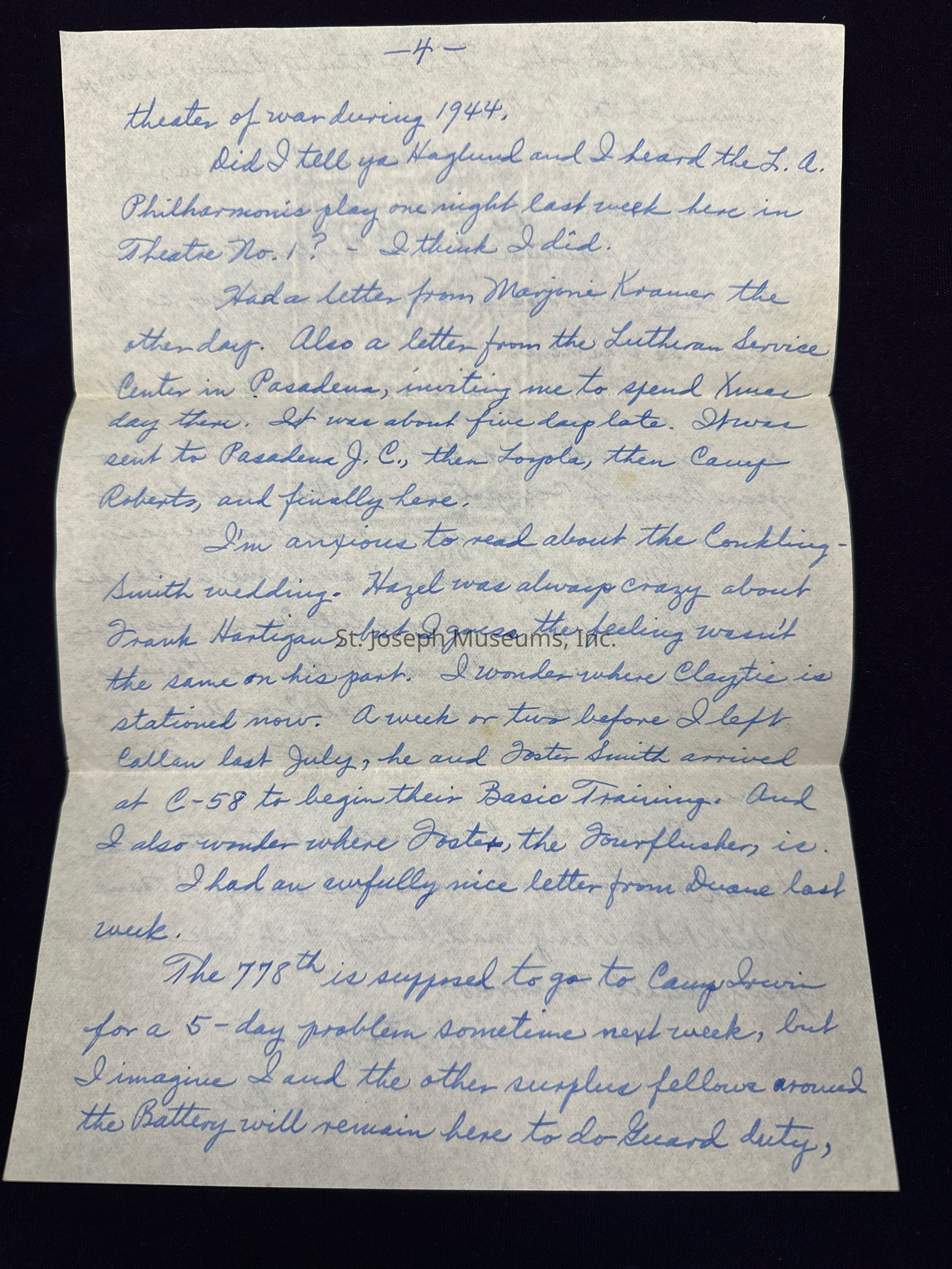 Had a letter from Marjorie Kramer the other day. Also a letter from the Lutheran Service Center in Pasadena, inviting me to spend Xmas day there. It was about five days late. It was sent to Pasadena J.C., then Loyola, then Camp Roberts, and finally here.