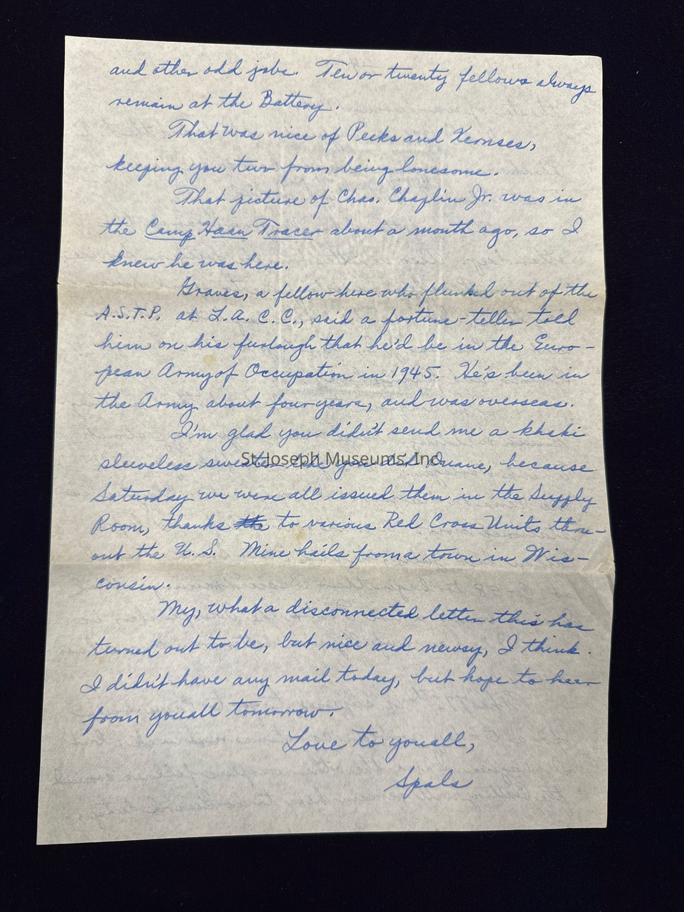 Handwritten letter home to parents back in St. Joseph after being called up to serve in the US Army during WWII. Pvt. Spalsbury, at the time of this letter, has completed Basic Training at Camp Callan, California, was stationed for a short time with a STAR Unit for ASTP (Army Specialized Training Program) soldiers in Pasadena, CA then moved to engineering training at Loyola University in Los Angeles, CA. After flunking out of the ASTP program, Robert was briefly stationed at Camp Roberts, located in central California assigned to the Infantry Replacement Training Center. At the time of this letter, Robert is stationed at Camp Haan in southern California, a U.S. Army training camp for Coast Artillery Anti Aircraft gunners.