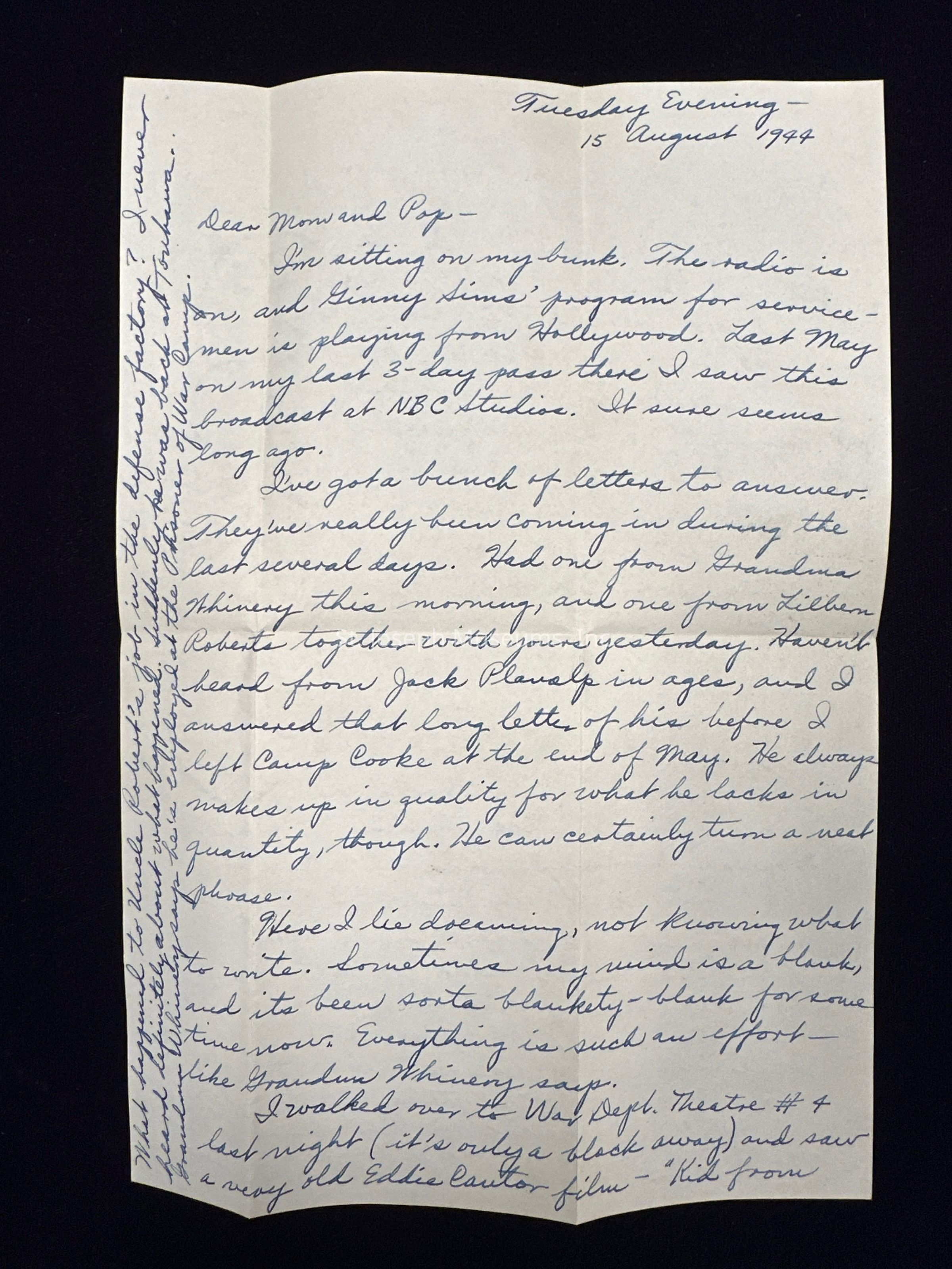 I'm sitting on my bunk. The radio is on, and Ginny Sims' program for servicemen is playing from Hollywood. Last May on my last 3-day pass there I saw this broadcast at NBC studios. It sure seems long ago.