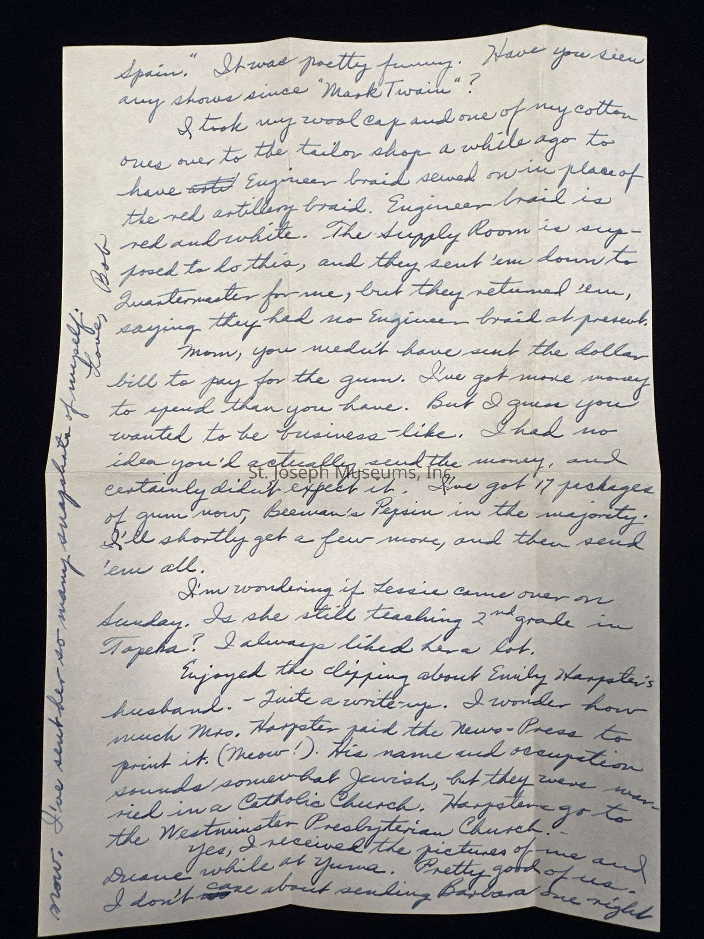 Handwritten letter home to parents back in St. Joseph after being called up to serve in the US Army during WWII. Pvt. Spalsbury, at the time of this letter, has completed Basic Training at Camp Callan, California, was stationed for a short time with a STAR Unit for ASTP (Army Specialized Training Program) soldiers in Pasadena, CA then moved to engineering training at Loyola University in Los Angeles, CA. After flunking out of the ASTP program, Robert was briefly stationed at Camp Roberts, located in central California assigned to the Infantry Replacement Training Center. Then Robert was stationed at Camp Haan in southern California, a U.S. Army training camp for Coast Artillery Anti Aircraft gunners. During his time at Camp Haan, Robert was transferred from Battery B to Battery A and began working as an office Clerk in Battery A.
