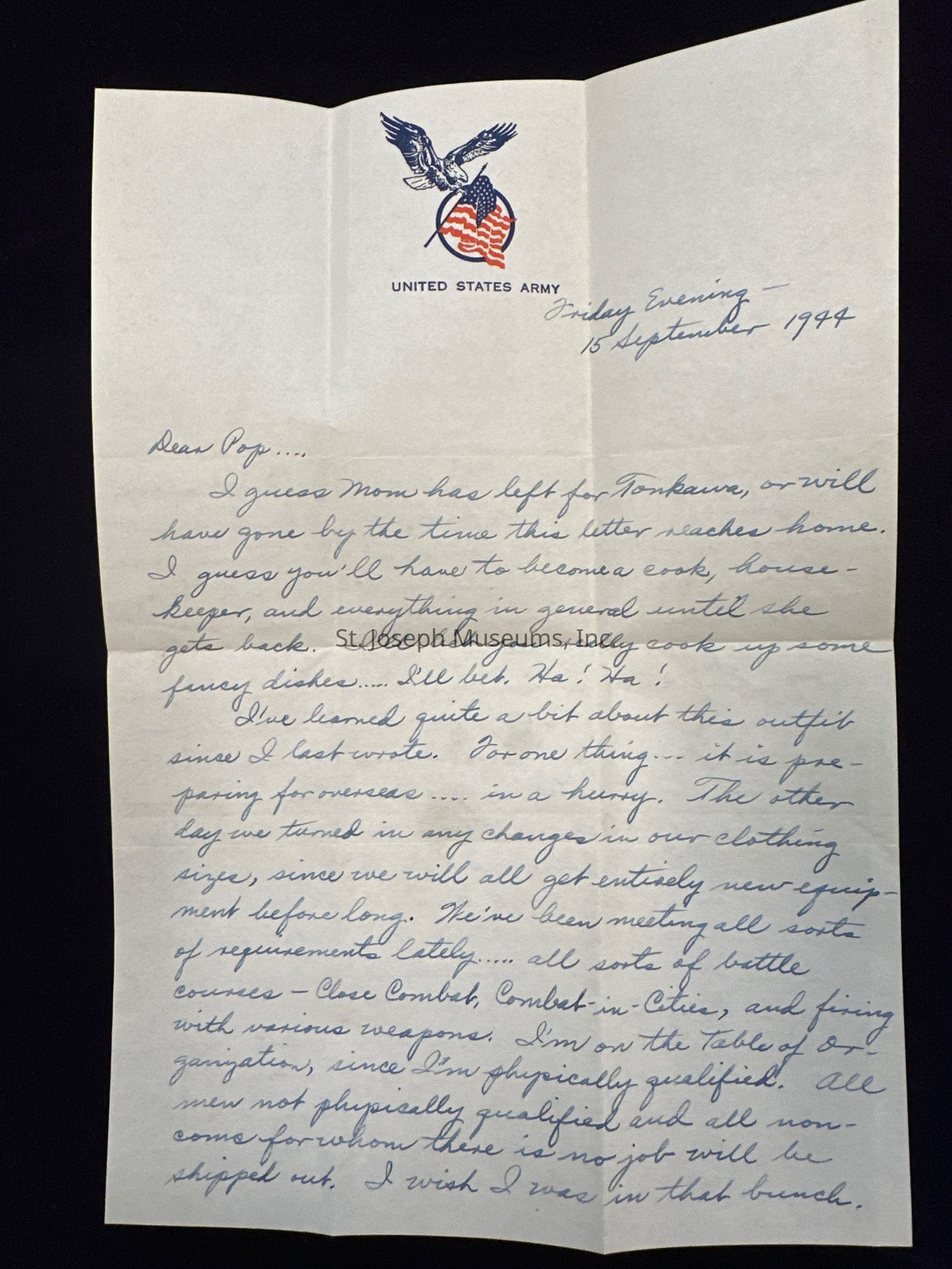 Handwritten letter home to parents back in St. Joseph after being called up to serve in the US Army during WWII. Pvt. Spalsbury, at the time of this letter, has completed Basic Training at Camp Callan, California, was stationed for a short time with a STAR Unit for ASTP (Army Specialized Training Program) soldiers in Pasadena, CA then moved to engineering training at Loyola University in Los Angeles, CA. After flunking out of the ASTP program, Robert was briefly stationed at Camp Roberts, located in central California assigned to the Infantry Replacement Training Center. Then Robert was stationed at Camp Haan in southern California, a U.S. Army training camp for Coast Artillery Anti Aircraft gunners. During his time at Camp Haan, Robert was transferred from Battery B to Battery A and began working as an office Clerk in Battery A. At the time this letter was written, Robert is serving at Camp Chaffee at Fort Smith, Arkansas. He had been working as a Clerk-Typist in the HQ Company but has now been transferred to Line Company A, still working as an office clerk. This letter is one page, front and back, written in blue ink on United States Army stationery which features a red and blue inked emblem centered on the page with an eagle in flight carrying a U.S. flag. The letter was sent in a plain envelope. The page is folded in half and then in thirds. Robert decided to send this letter under free postage instead of airmail.