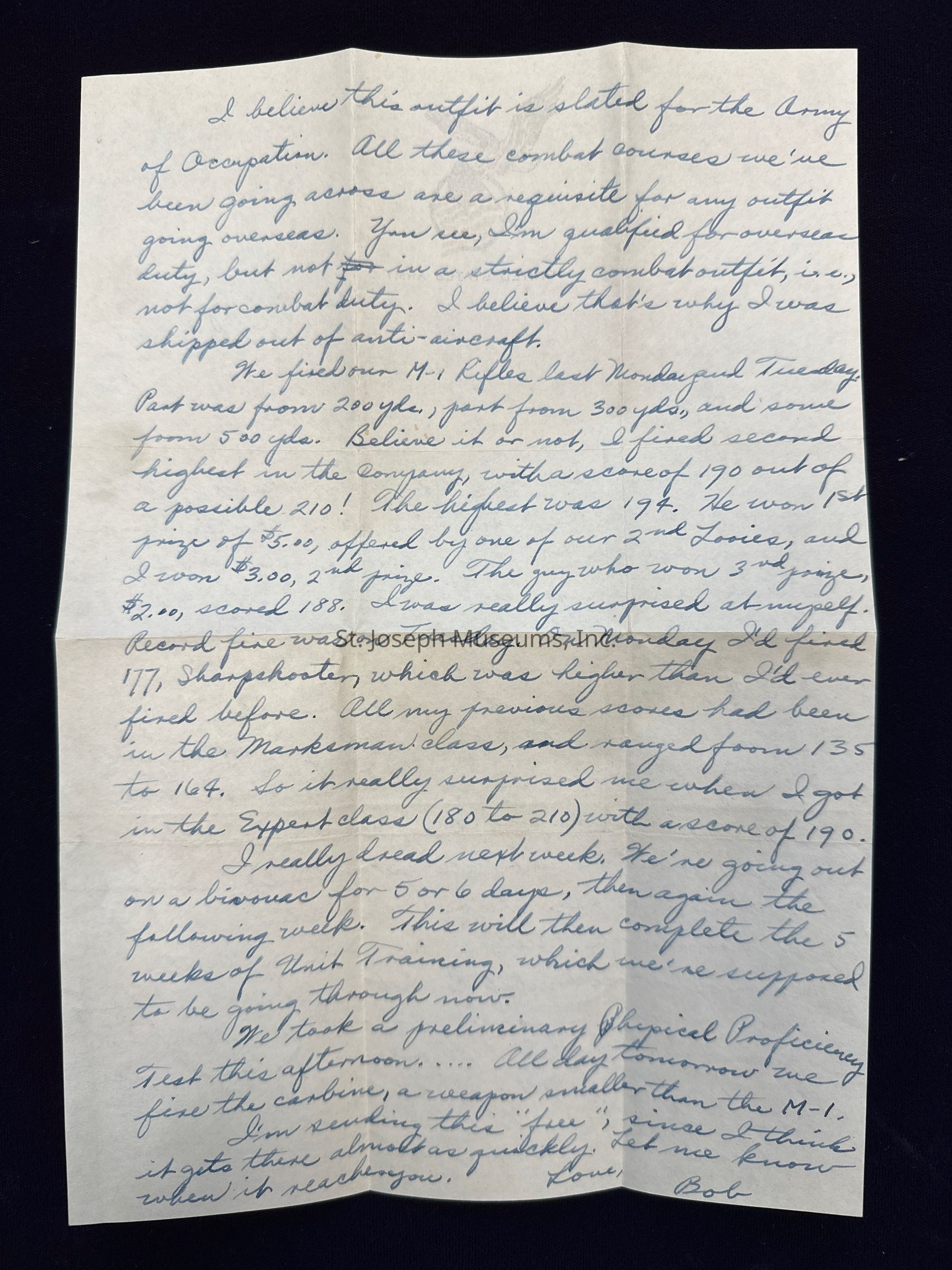 Friday Evening - 15 September 1944 Dear Pop.... I guess Mom has left for Tonkawa, or will have gone by the time this letter reaches home. I guess you'll have to become a cook, housekeeper, and everything in general until she gets back. I'll bet you really cook up some fancy dishes.....I'll bet. Ha! Ha! I've learned quite a bit about this outfit since I last wrote. For one thing...It is preparing for overseas....in a hurry. The other day we turned in any changes in our clothing sizes, since we will all get entirely new equipment before long. We've been meeting all sorts of requirements lately....all sorts of battle courses - Close Combat, Combat-in-Cities, and firing with various weapons. I'm on the Table of Organization, since I'm physically qualified. All men not physically qualified and all non-coms for whom there is no job will be shipped out. I wish I was in that bunch. I believe this outfit is slated for the Army of Occupation. All these combat courses we've been going across are a requisite for any outfit going overseas. You see, I'm qualified for overseas duty, but not in a strictly combat outfit, i.e., not for combat duty. I believe that's why I was shipped out of anti-aircraft. We fired our M-1 Rifles last Monday and Tuesday. Part was from 200 yds., part from 300 yds., and some from 500 yds. Believe it or not, I fired second highest in the Company, with a score of 190 out of a possible 210! The highest was 194. He won 1st prize of $5.00, offered by one of our 2nd Louies, and I won $3.00, 2nd prize. The guy who won 3rd prize, $2.00, scored 188. I was really surprised at myself. Record fire was on Tuesday. On Monday I'd fired 177, Sharpshooter, which was higher than I'd ever fired before. All my previous scores had been in the Marksman class, and ranged from 135 to 164. So it really surprised me when I got in the Expert class (180 to 210) with a score of 190. I really dread next week. We're going out on a bivouac for 5 or 6 days, then again the following week. This will then complete the 5 weeks of Unit Training, which we're supposed to be going through now. We took a preliminary Physical Proficiency Test this afternoon..... All day tomorrow we fire the carbine, a weapon smaller than the M-1. I'm sending this "free," since I think it gets there almost as quickly. Let me know when it reaches you. Love, Bob