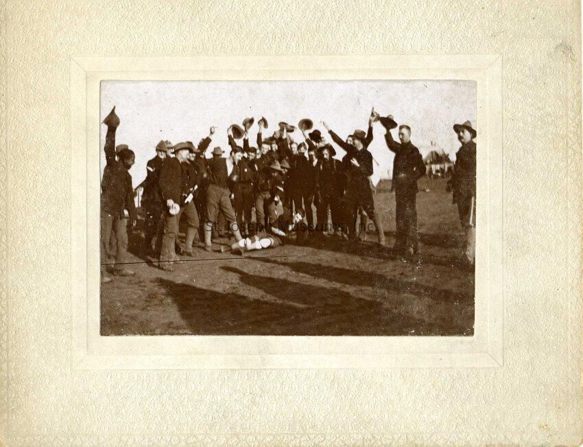 Spanish American War Soldiers Boxing Match Results, 1898. Two men boxing, 1 man on the ground. Other soldiers surround and raise their hats. Spanish American War Training Camp, Gettysburg, PA.