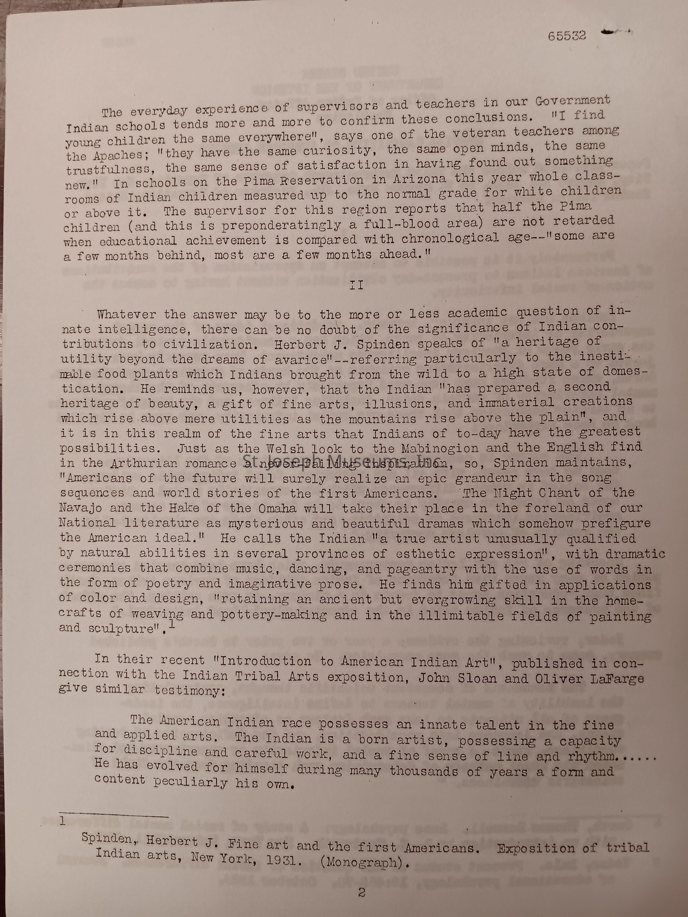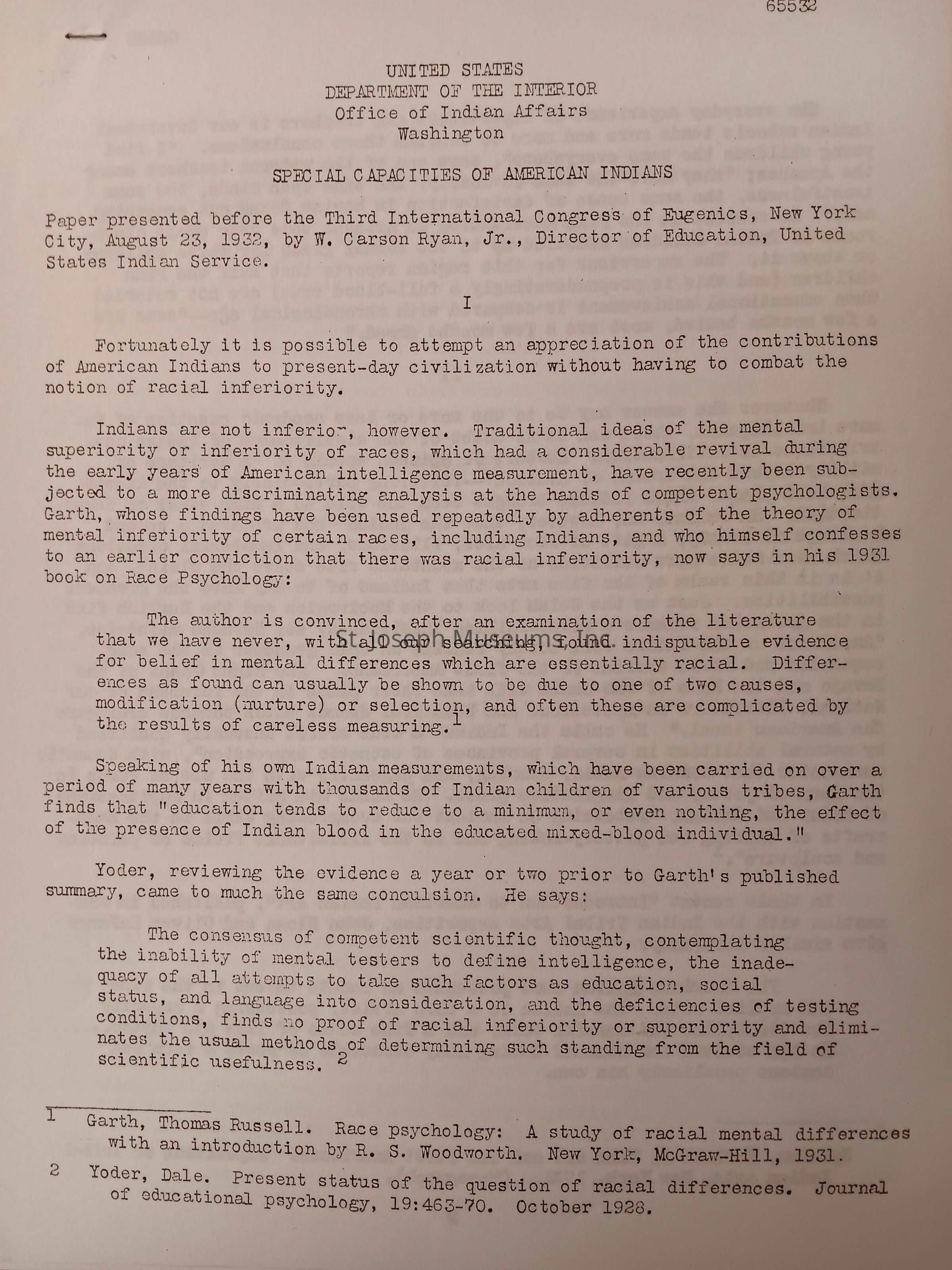 Special Capabilities of American Indians, Paper Given at Congress of Eugenics, August 23, 1932. Given before 3rd International Congress of Eugenics in New York City by W. Carson Ryan, Jr., Director of Education, U.S. Indian Service. Debunks theory of Indian mental inferiority and focuses on Indian contributions to society, especially their art. #65532