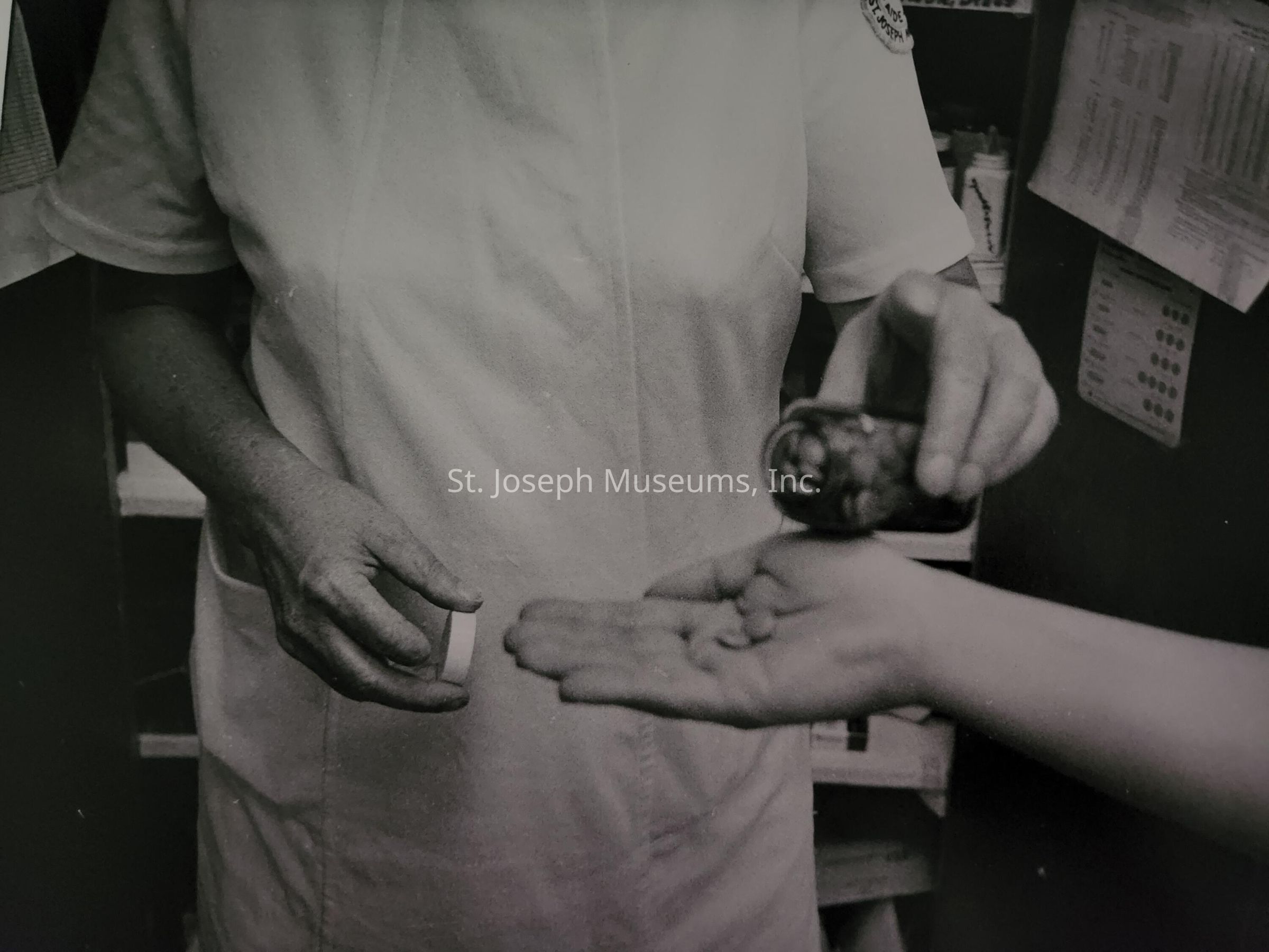 State Hospital Staff Photo of Psychiatric Aid Dispensing Medication, c. 1970. A psychiatric aid shakes pills from a bottle into someone's hand.