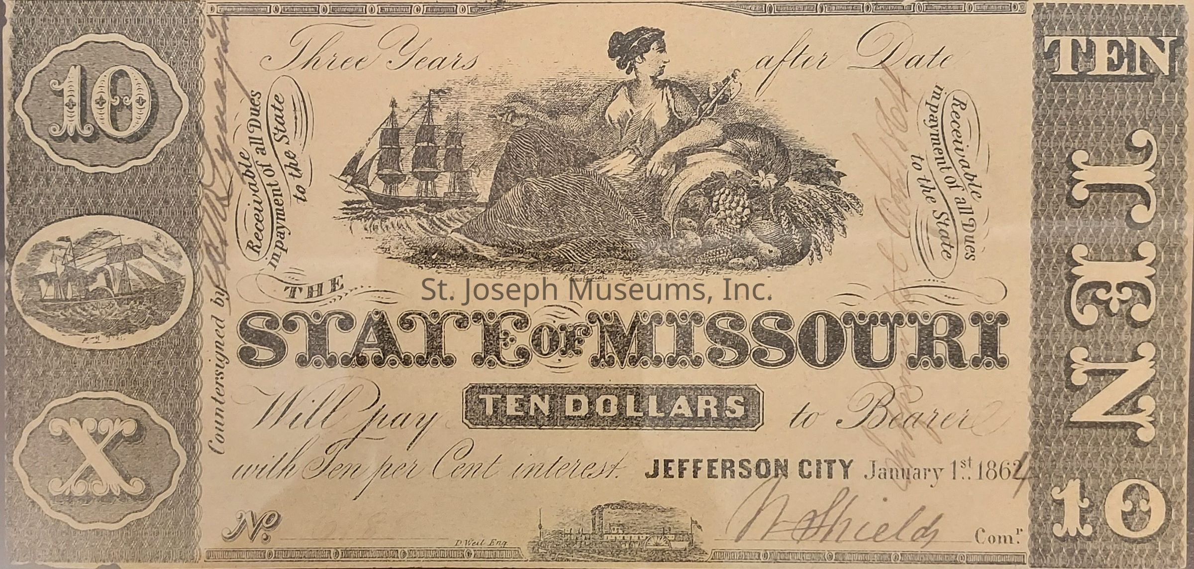 State of Missouri Ten Dollars, 1864. January 1, 1864.