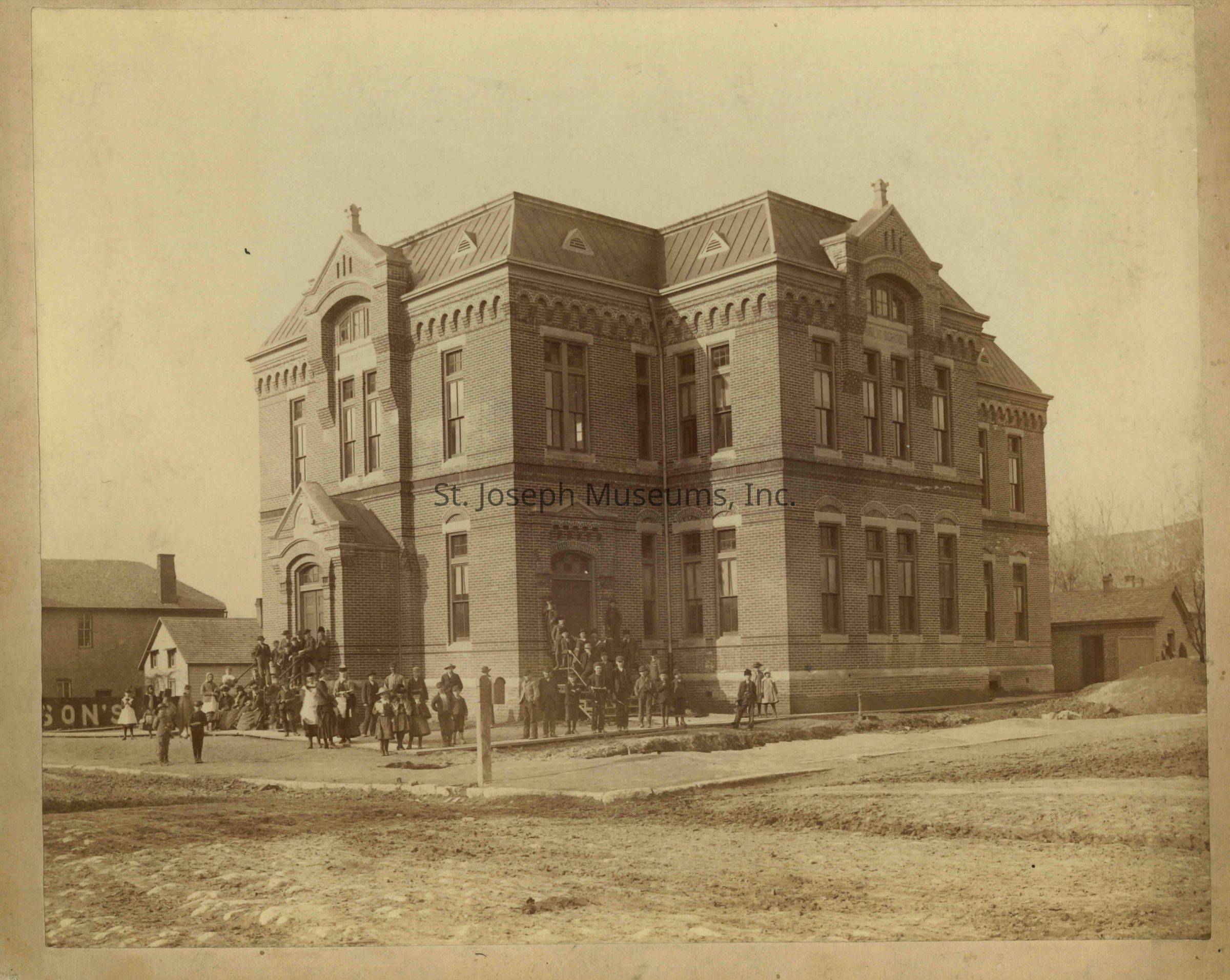 Steinecker School, 720 N. Second, Second & Louis Street, S,W, corner, c. 1890. Designed in c.1883 by Eckel & Mann Architects. 07.33.801 Exterior View, 2-story brick, tall school with triangular "arch" at roof line on both sides visible. tall windows, arched decorative border at top above windows, steep metal roof, many students and teachers in front, everyone is wearing a hat, dirt streets. 8 x 10", mounted, c. 1890 There are 3 duplicate prints.