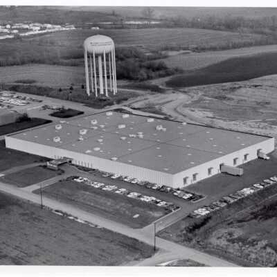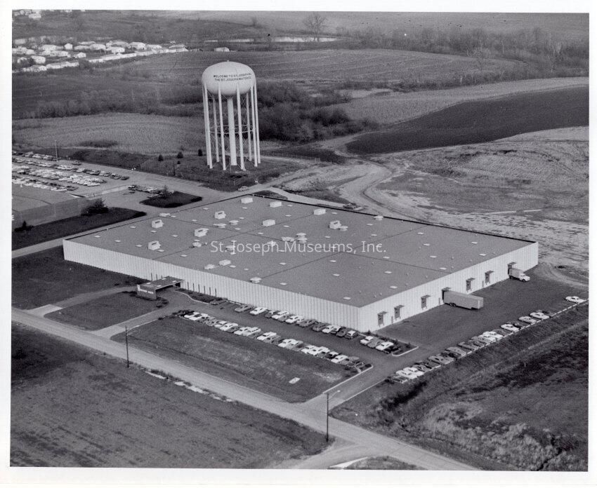 Stevens Hats Manufacturing Plant, 3601 S. Leonard Rd, Aerial Photo, c. 1960's. b/w. Aerial view of manufacturing plant in Industrial Park, St. Joseph Water Tower behind. 2 copiesCollection