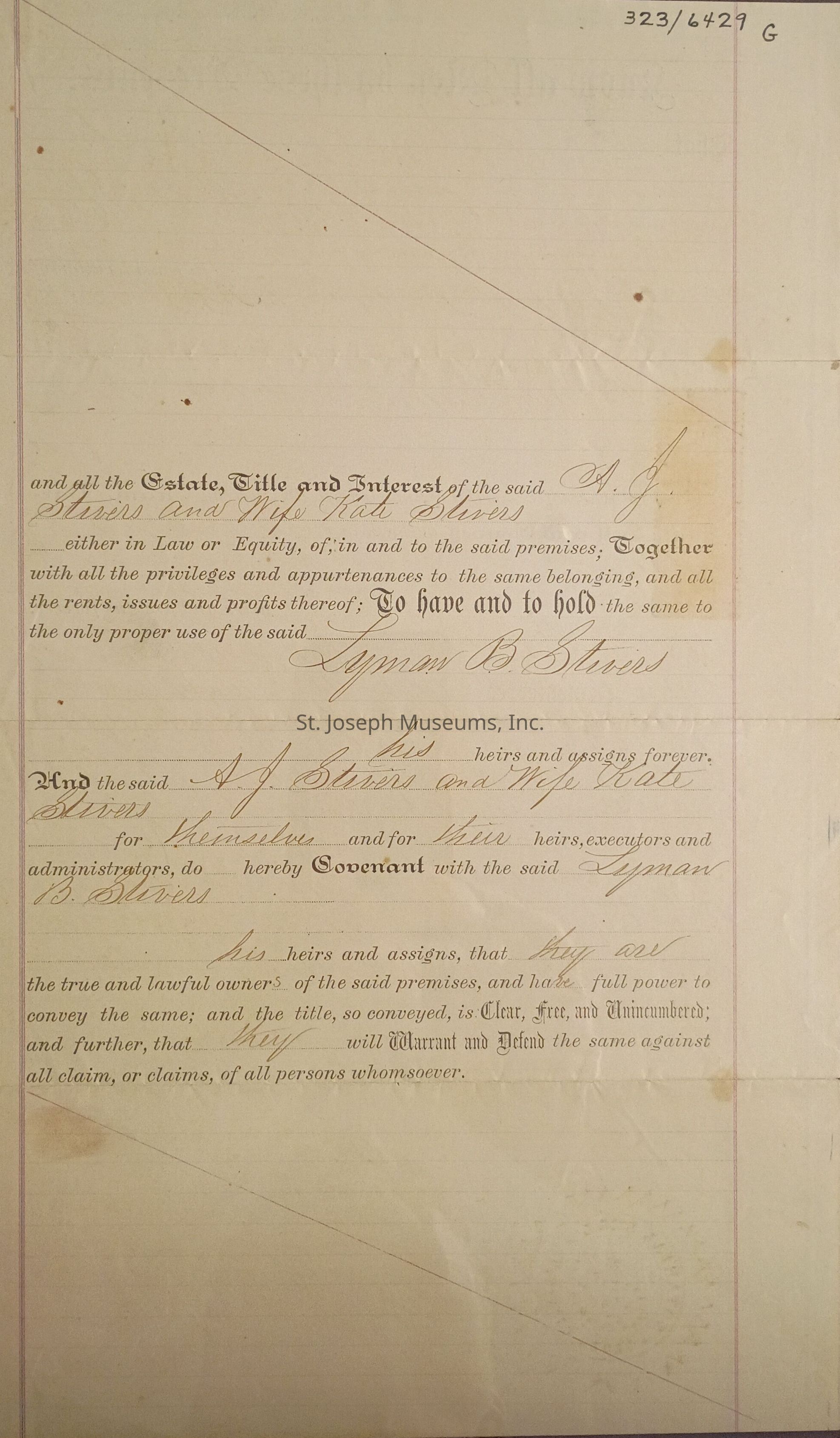 Stivers, A. J. and Kate Stivers Warranty Deed To Lyman B. Stivers, Nebraska, 1861Entry/Object ID