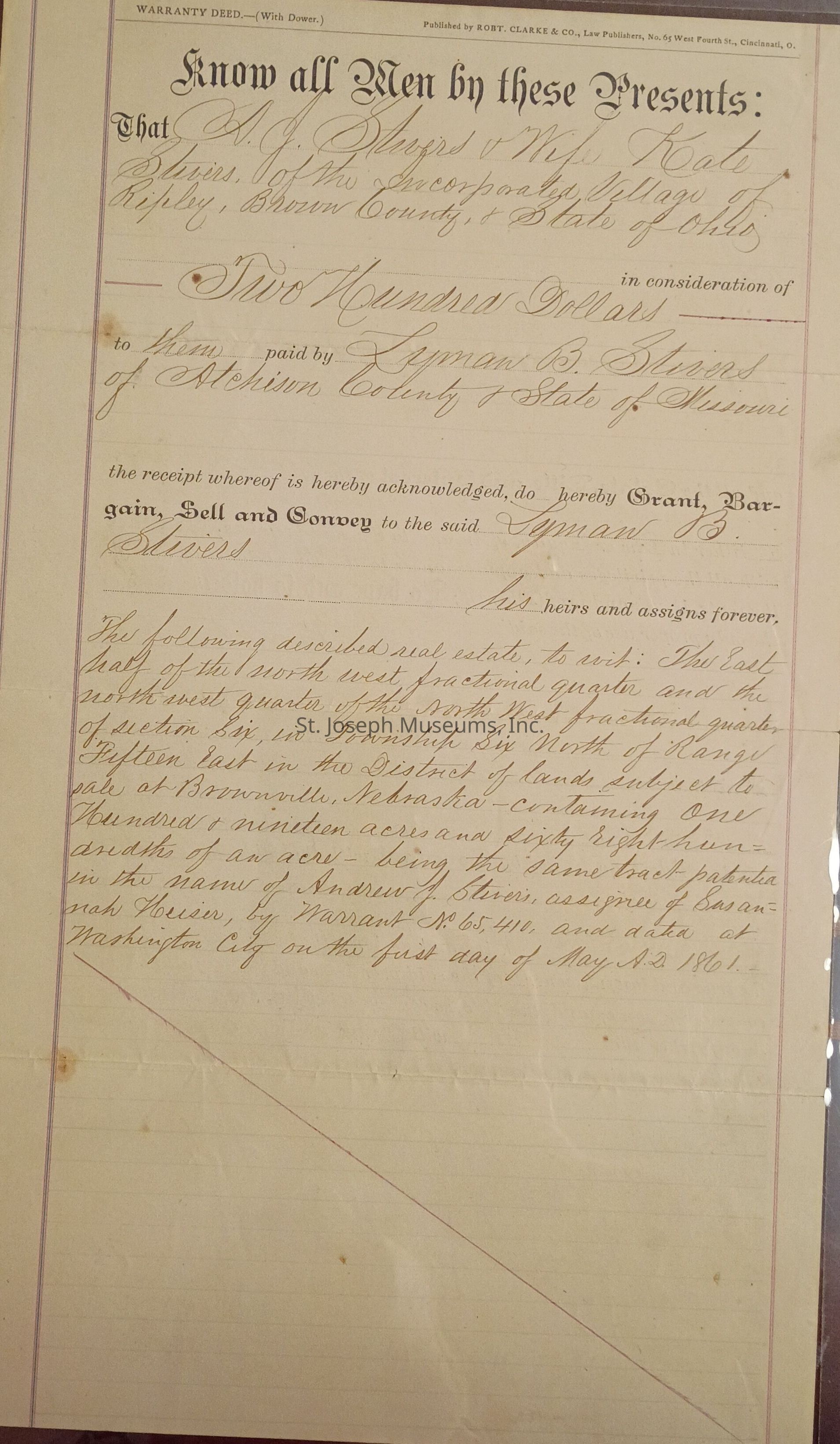 Warranty Deed A. J. Stivers And Kate Stivers to Lyman B. Stivers for the sum of $200 the East half of the northwest fractional quarter and the Northwest quarter of the Northwest fractional quarter of section 6 in township 6 North of range 15 East in the District of lands subject to sale at Brownville, Nebraska containing 119 acres and 68 hundredths of an acre being the same tract in the name of A. J Striver assignee of Susannah Heiser by Warrant Number 65410 and dated at Washington City on the first day of May 1861.Lexicon