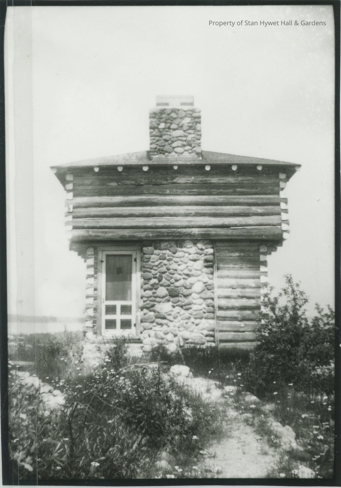Black and white photographic print of the Block House at Cedar Lodge. A stone-lined path leads up to cabin. One door on end of building, fireplace chimney in center. Stone lined walks. Lake Huron in background.Photograph Details