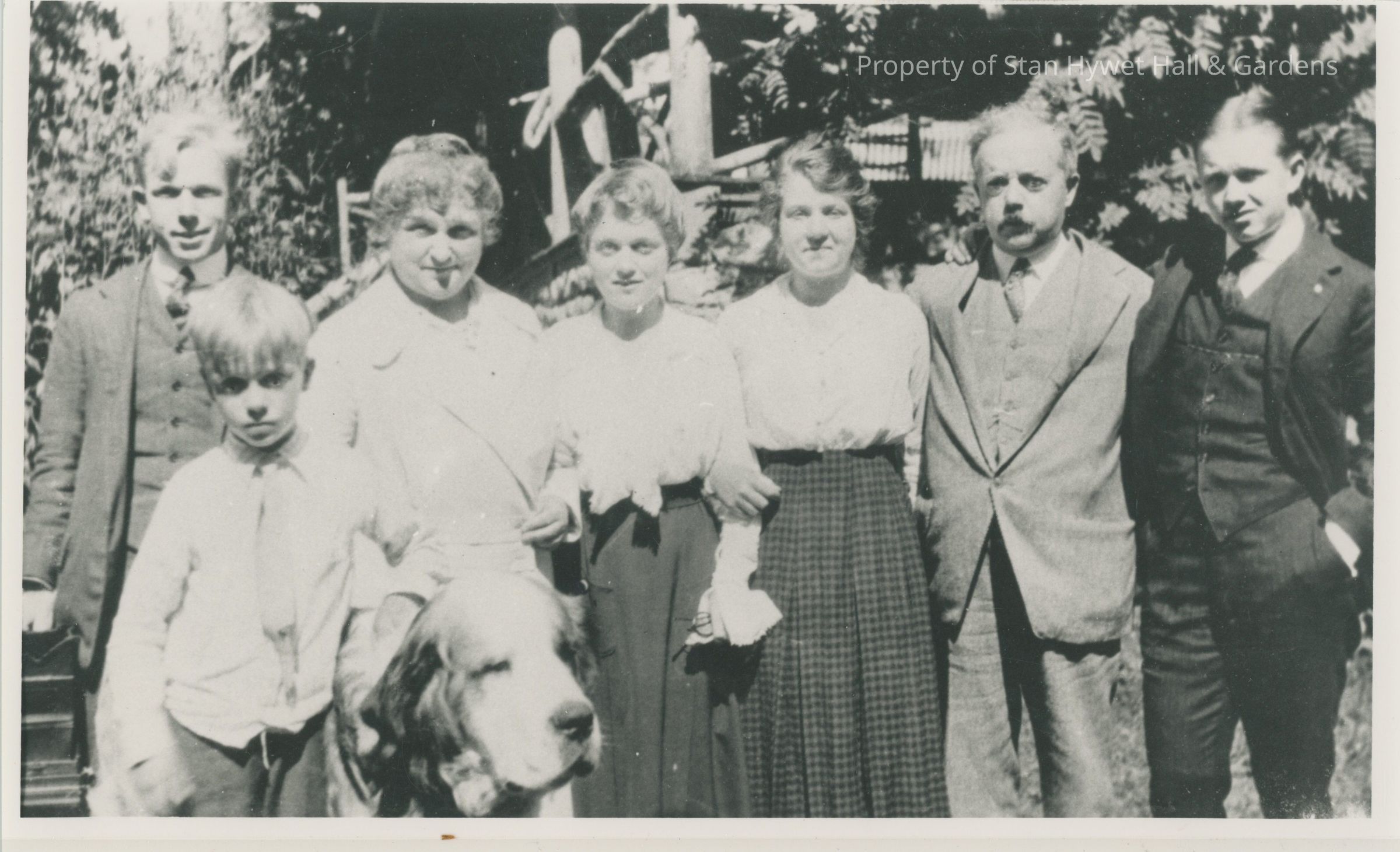 Black and white photographic print of Seiberling family members posed at Cedar Lodge, Hessel. Taken at Cedar Lodge outside cottage. Group posed standing [left to right]: Willard, Franklin [foreground], large dog, Gertrude, Irene, Virginia, F.A. and Penfield. Willard is holding large camera in his right hand. Franklin has his left hand and arm on a large dog. The three females have arms linked together. Pair of glasses in Irene's left hand. Section of porch and foliage in background.Photograph Details