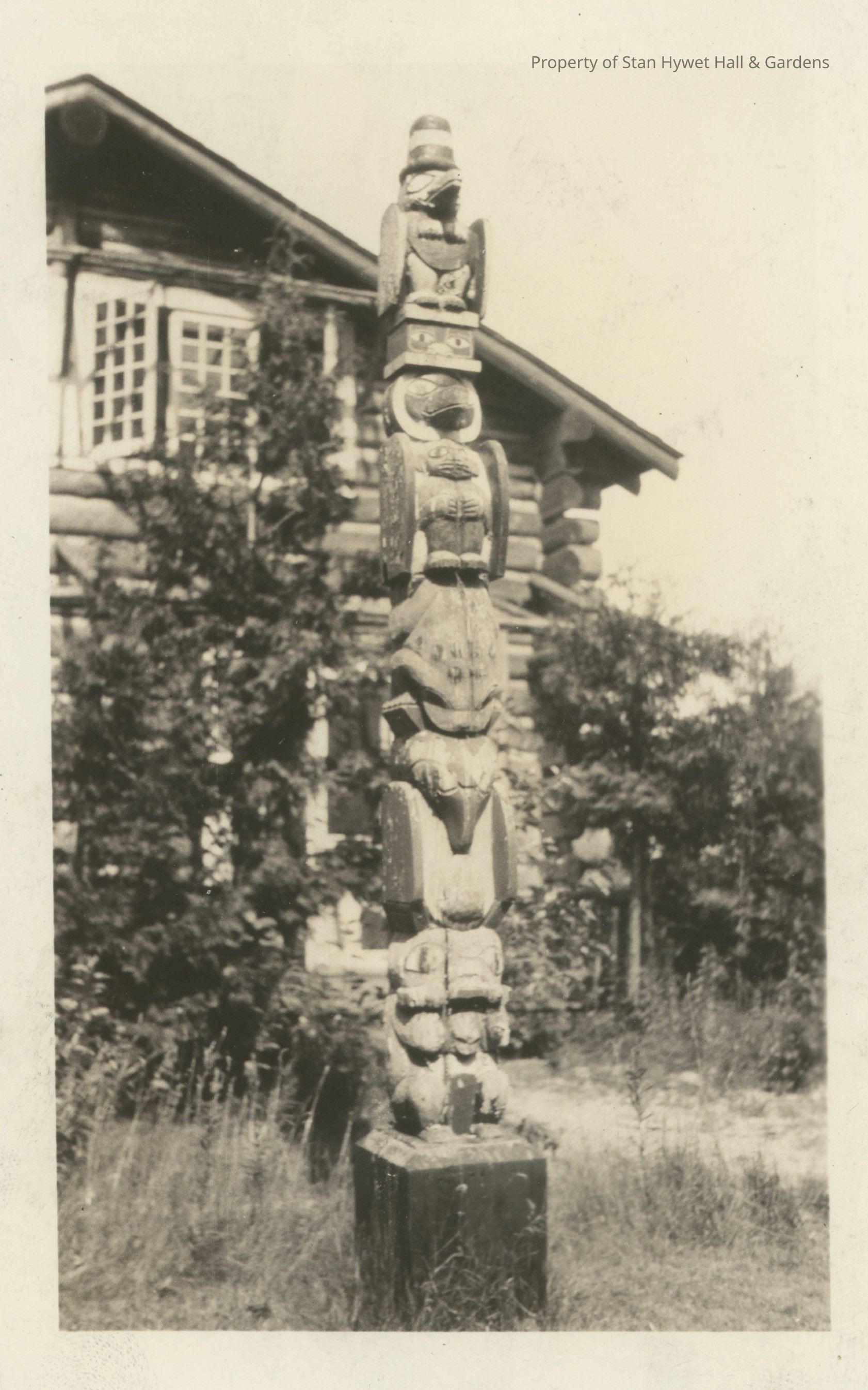 Black and white photographic print with white border. One of a series of 8 photos included in a photo album (SHH 2011.42). Totem pole at Main Cabin of Cedar Lodge in Hessel, Michigan. View from left with log building behind.Photograph Details