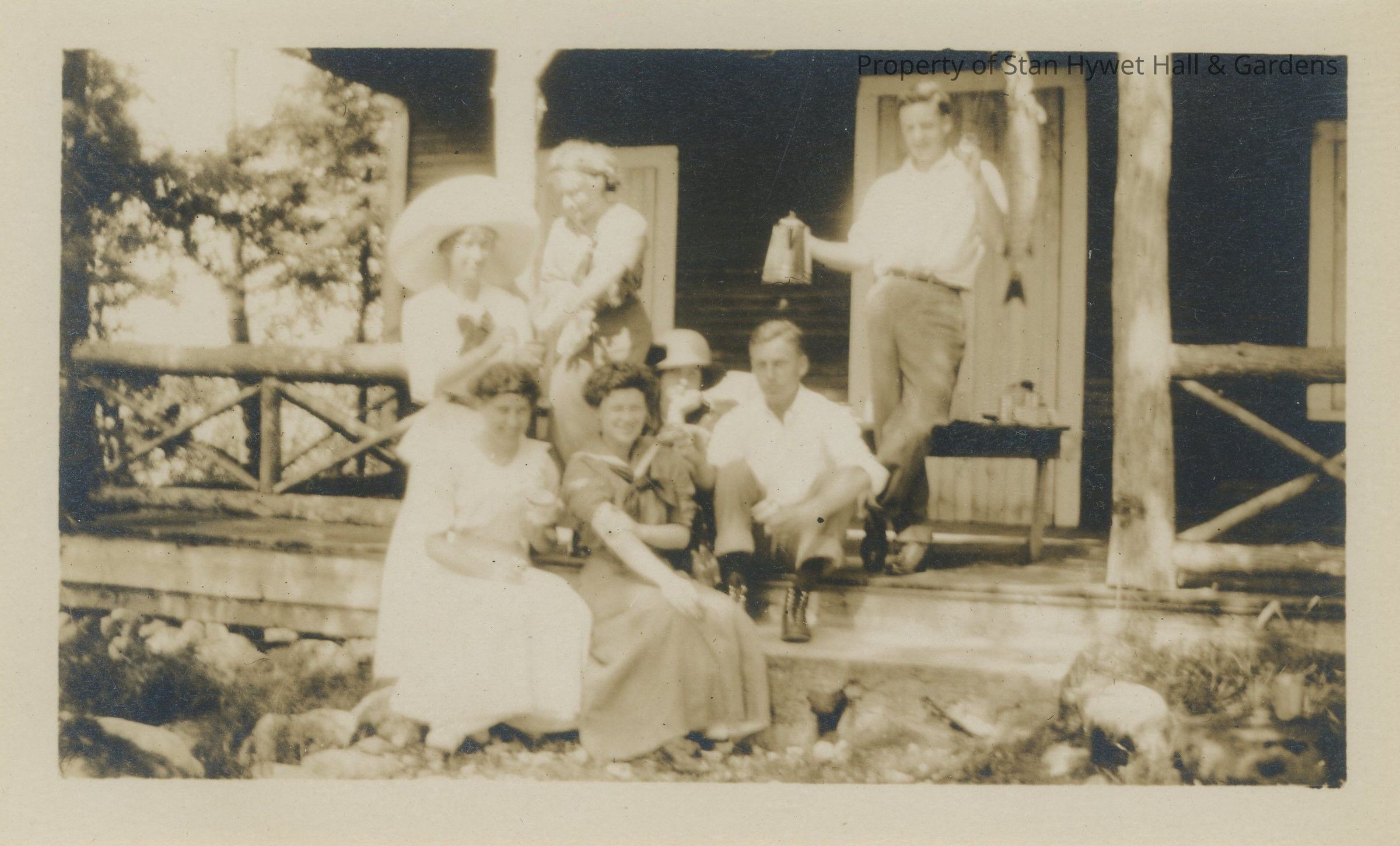 Group of people on the porch of the Main Cabin at Cedar LodgeEntry/Object ID