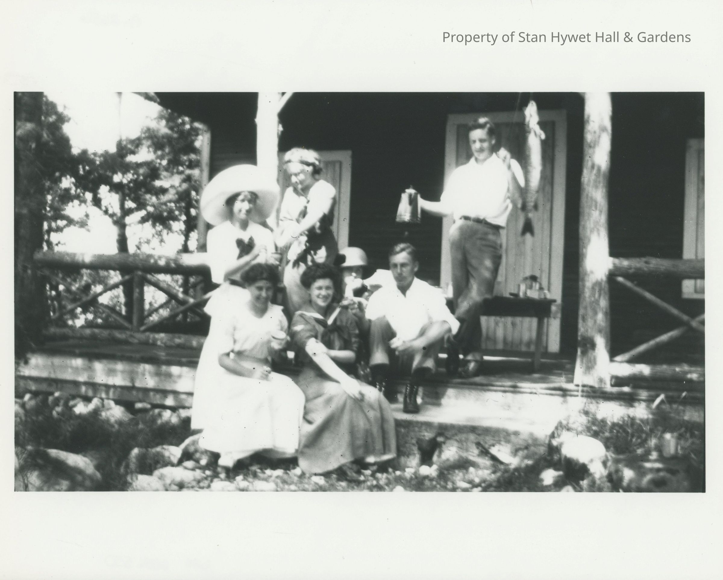 Black and white glossy photo with white border. View of 7 people, 5 women and 2 men, on porch of Main Cabin at Cedar Lodge with log porch rail. Large fish hanging from roof next to man standing with metal coffee pot in right hand. The rest of the people are seated . One woman wearing sailor dress, others dressed in light colors. One wearing large white hat.Photograph Details