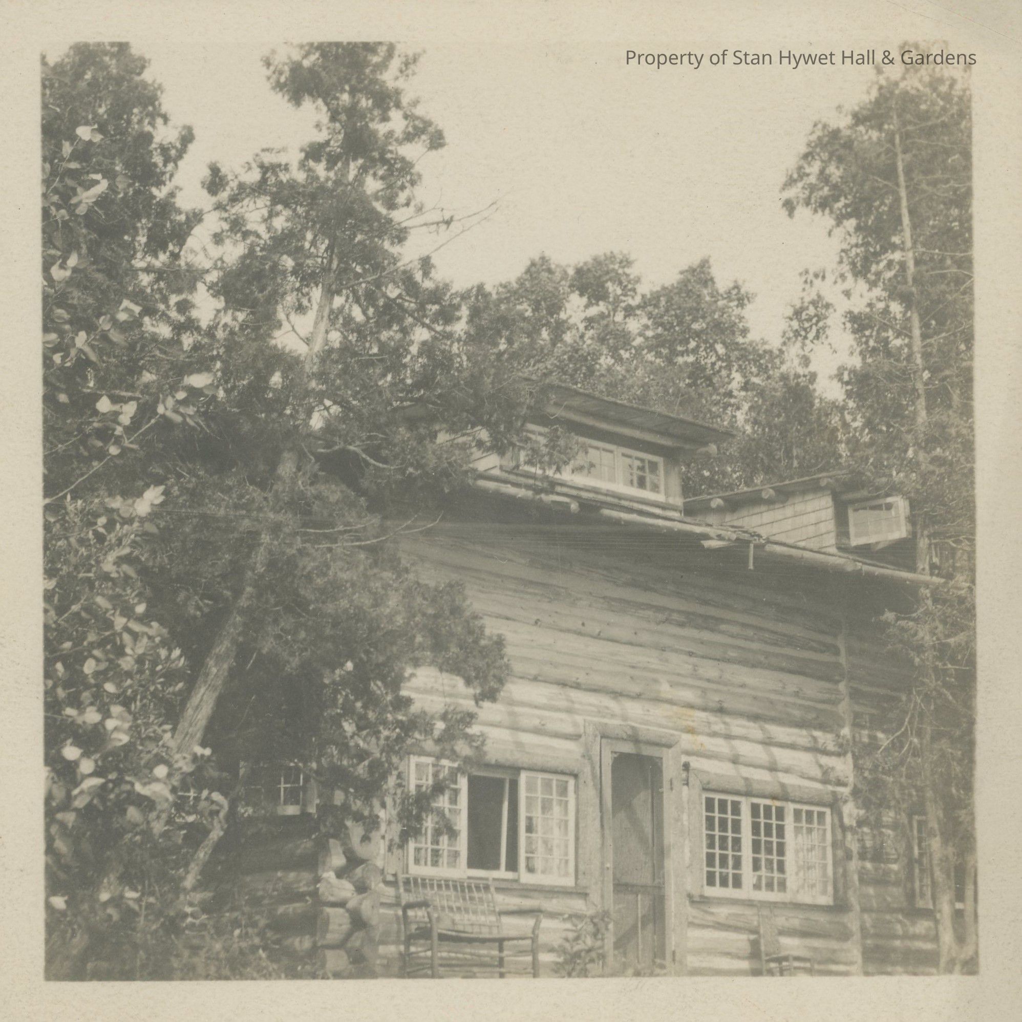 Black and white photograph of the exterior of the Shore Cabin at Cedar Lodge. Exterior view of log cabin with door in center and windows on each side with a wood settee under window on left, and chair under window on right. Second story dormer and roof visible. surrounded by trees and foliage.Photograph Details