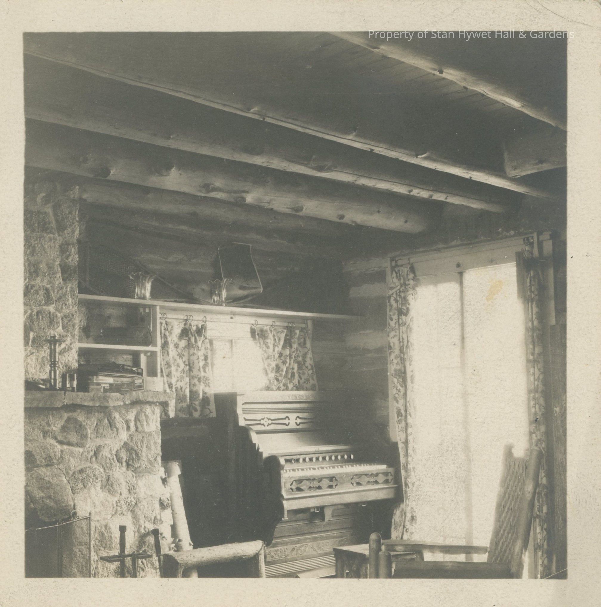 Black and white photograph of the interior of the Shore Cabin at Cedar Lodge. Living room with stone fireplace, and a pump organ in the center with a small window above it. At the right appears a large window or French door with curtains. Above the small window is a shelf with snow shoes. Candle stick is on mantel. Log beam ceiling is visible.Photograph Details