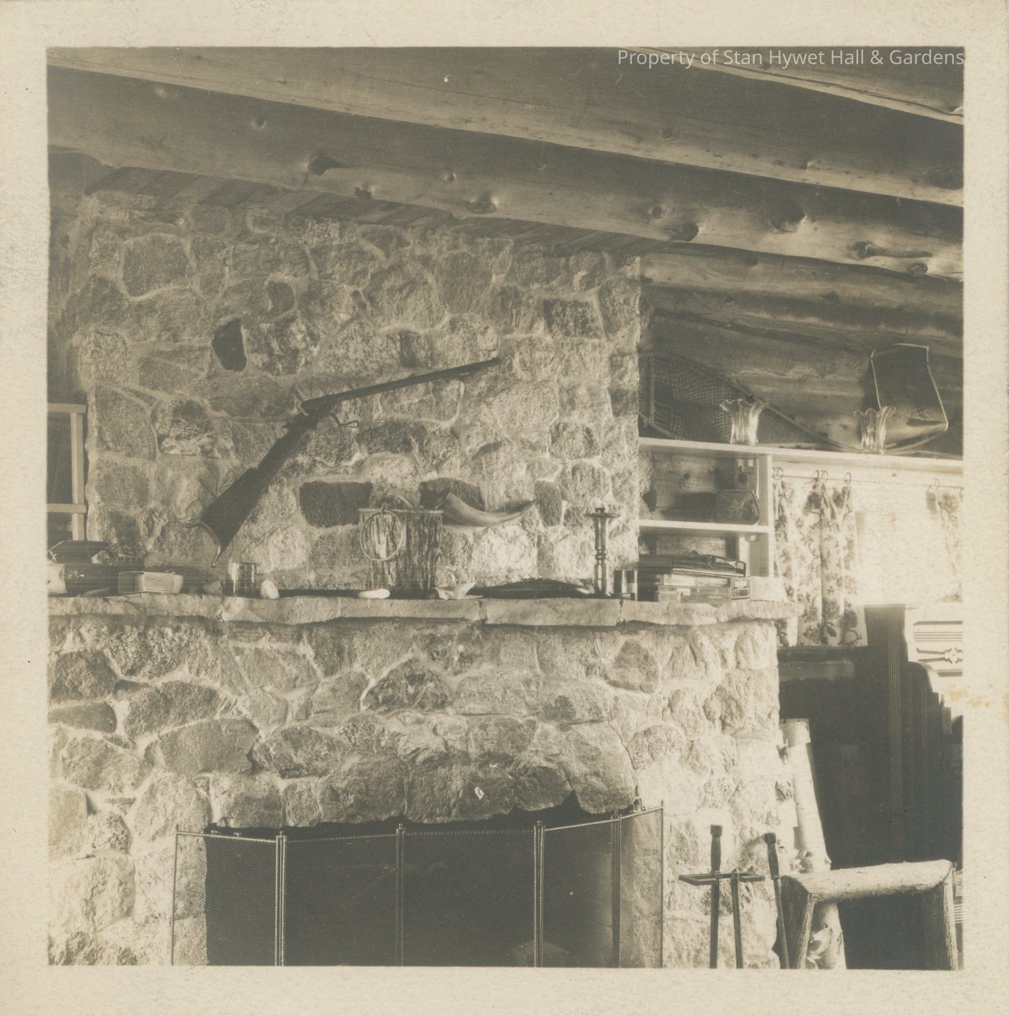Black and white photograph of the interior of the Shore Cabin at Cedar Lodge. Living room with stone fireplace in center an pump organ on extreme left. Displayed above mantel is a primitive rifle and powder horn. At the right appears a large window or French door with curtains. Above the small window on right is a shelf with snow shoes. Candle stick is on mantel. Log beam ceiling is visible.Photograph Details