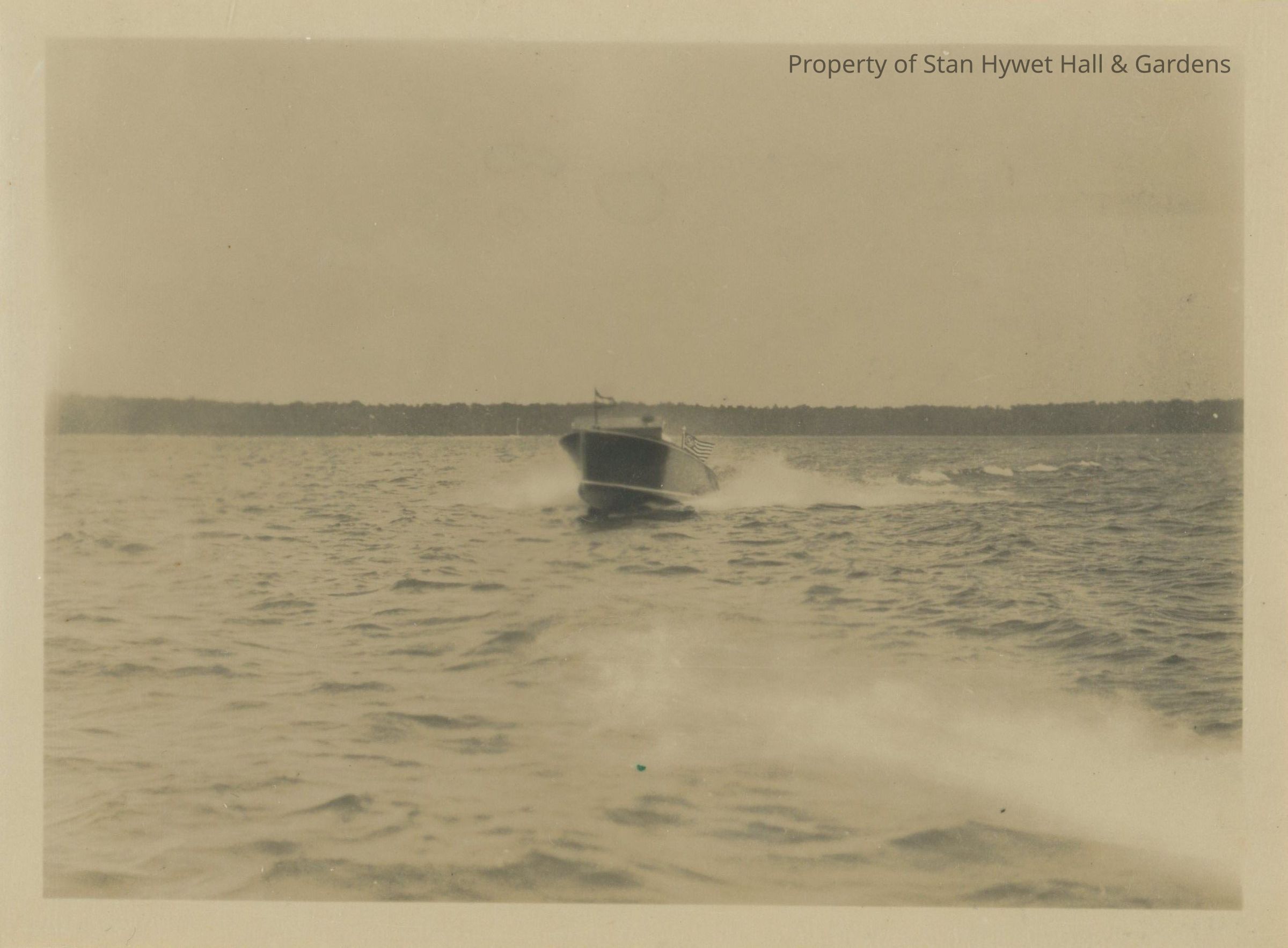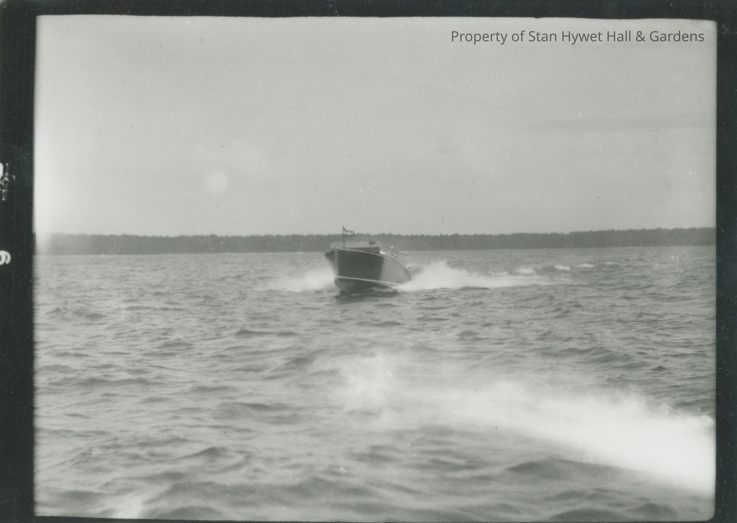 Black and white photo print/snapshot with white border. View of FA's motor boat on lake near Cedar Lodge, Michigan. Dark colored motor boat with light bottom trim heading toward camera with bow up and out of water. Only driver is visible behind windshield. Small flag on forward deck, and American flag at stern. Sky and wooded land in background; water in foreground.Photograph Details