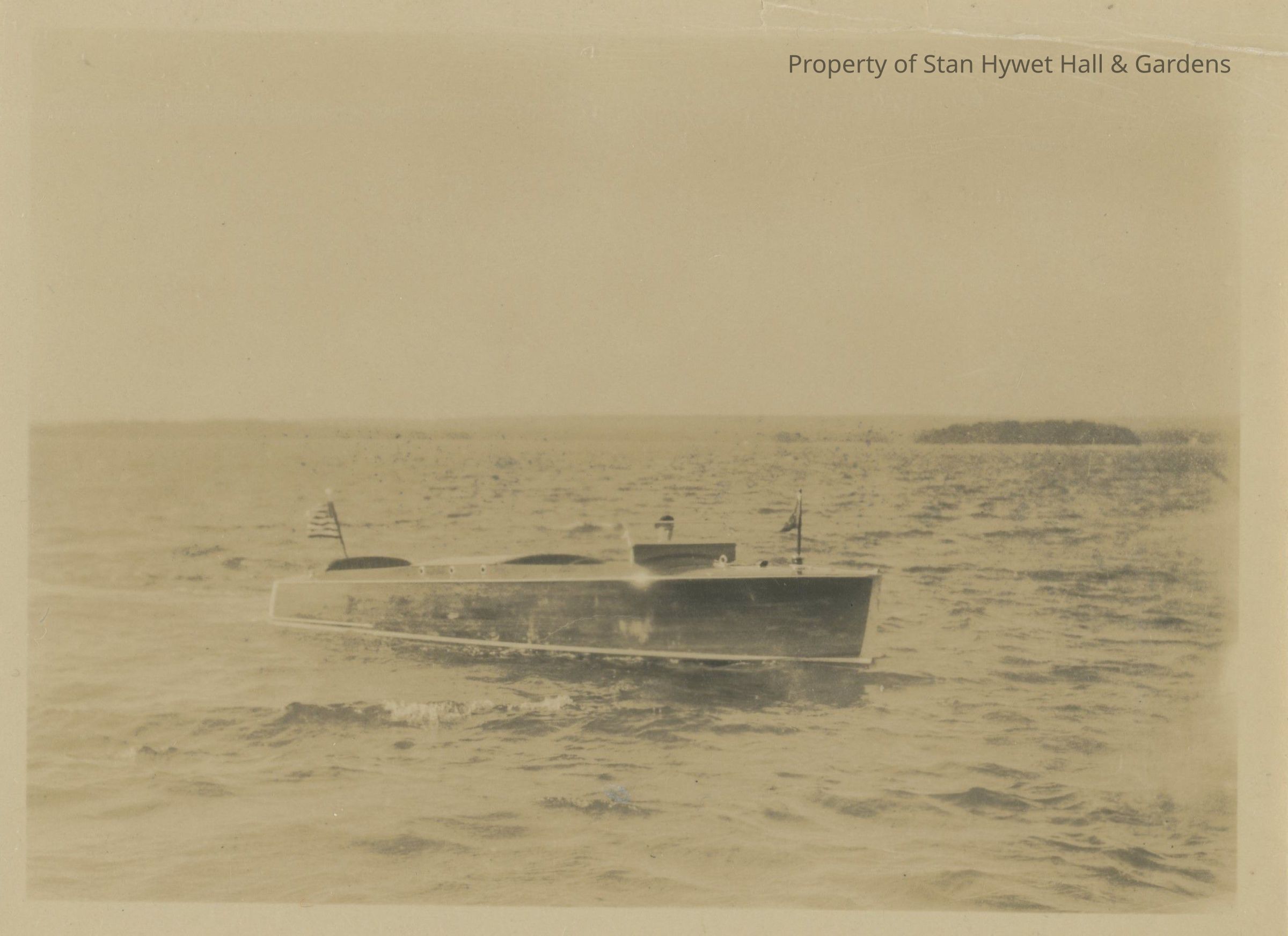 Black and white photo print/snapshot with white border. View of FA's motor boat on lake near Cedar Lodge, Michigan. Starboard view of dark colored motor boat with light bottom trim at water line, sitting still in water. Driver with cap is visible behind windshield. Small flag on forward deck, and American flag at stern. Sky and land or island in background; water in foreground.Photograph Details