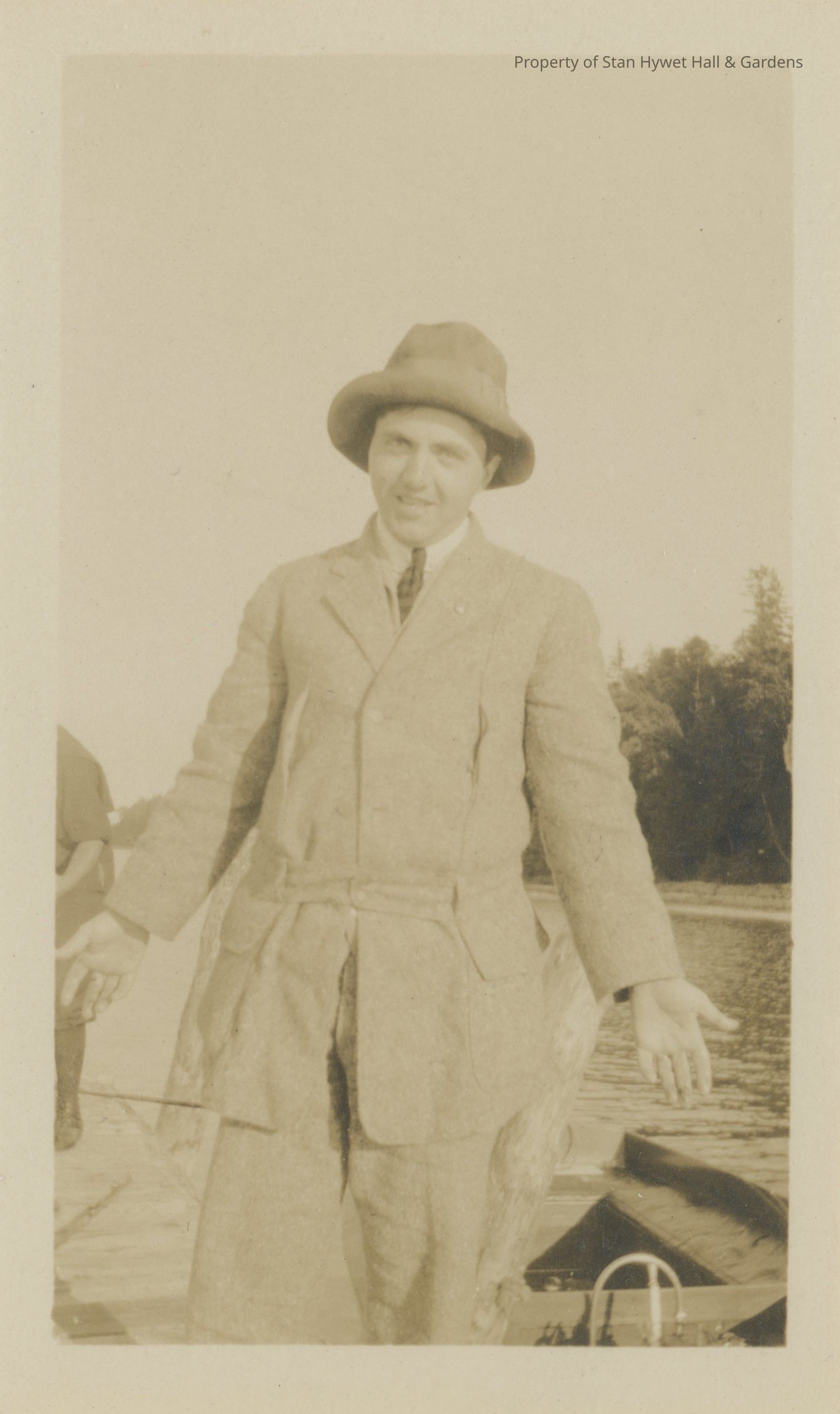 Black and white photograph with 3/16" white border. 3/4 view of Cecil Fanning standing on dock facing camera smiling, dressed in sport suit with hat. Land and shoreline is visible in background. Another man is practically visible at left.Photograph Details