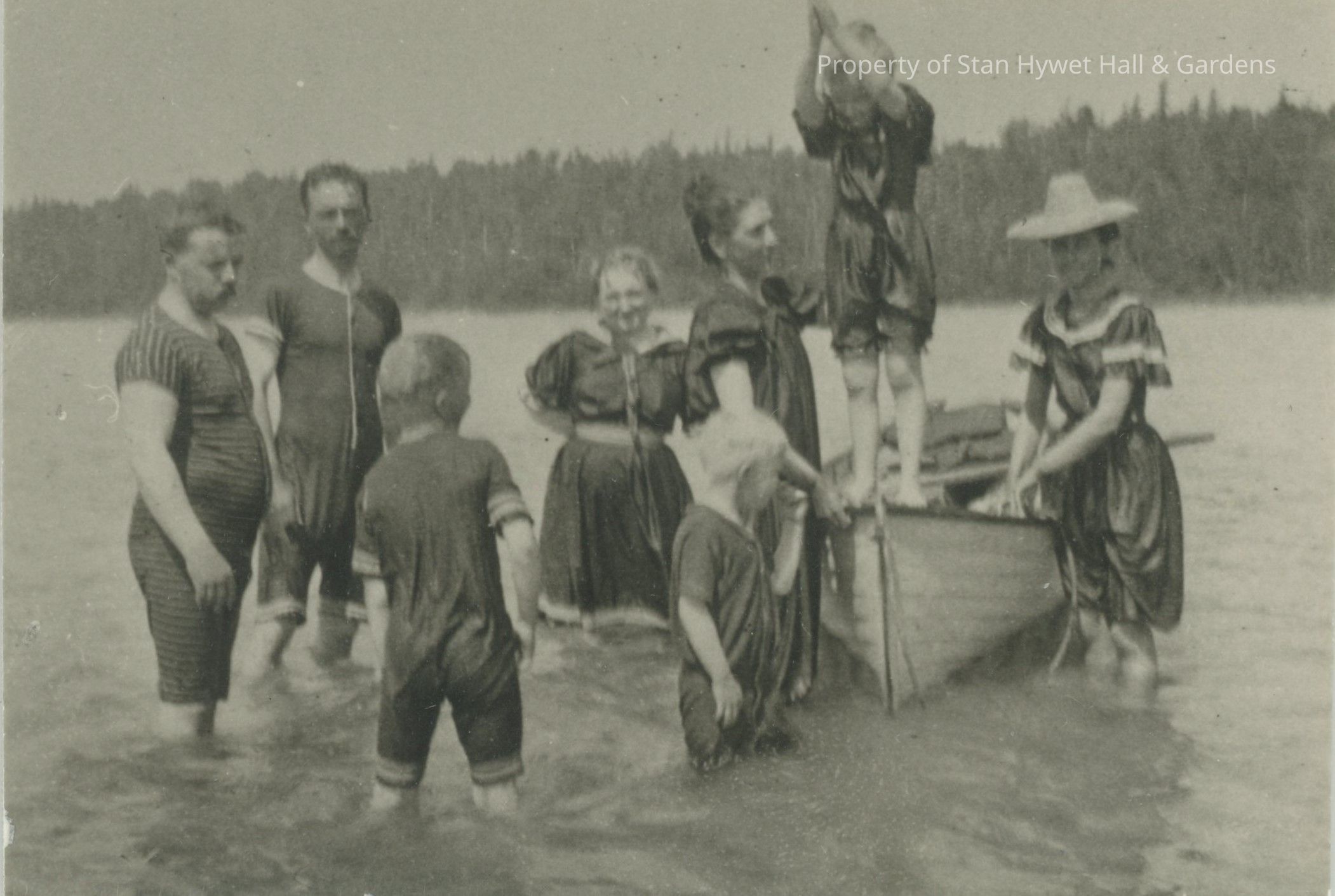 Two copies of a black and white photograph of Seiberling family members standing in water next to a row boat. Eight people including 2 men, 3 women, and 3 children in bathing suits. F.A. is on the left with Gertrude 4th from left. A little girl, possibly Irene, is on the bow of the boat ready to dive. The two young boys are possibly Fred and Willard. Land visible in background.