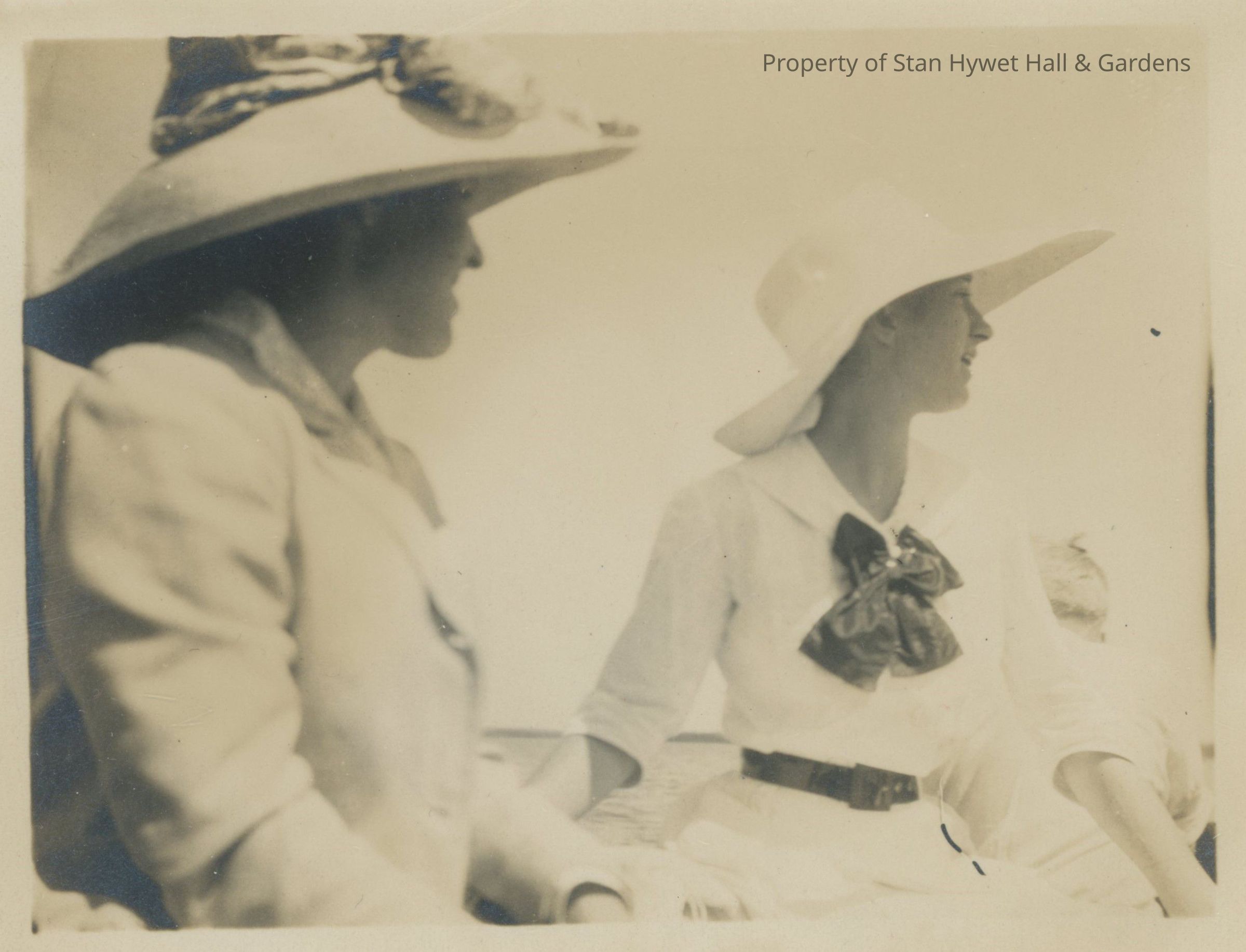 Black and white photographic print with 1/8" white border. Waist up view of two young women seated (possibly on a boat) facing right. Both dressed in light colored clothes with large brimmed hats. Woman on right has dark belt and bow. Water visible in background.Collection