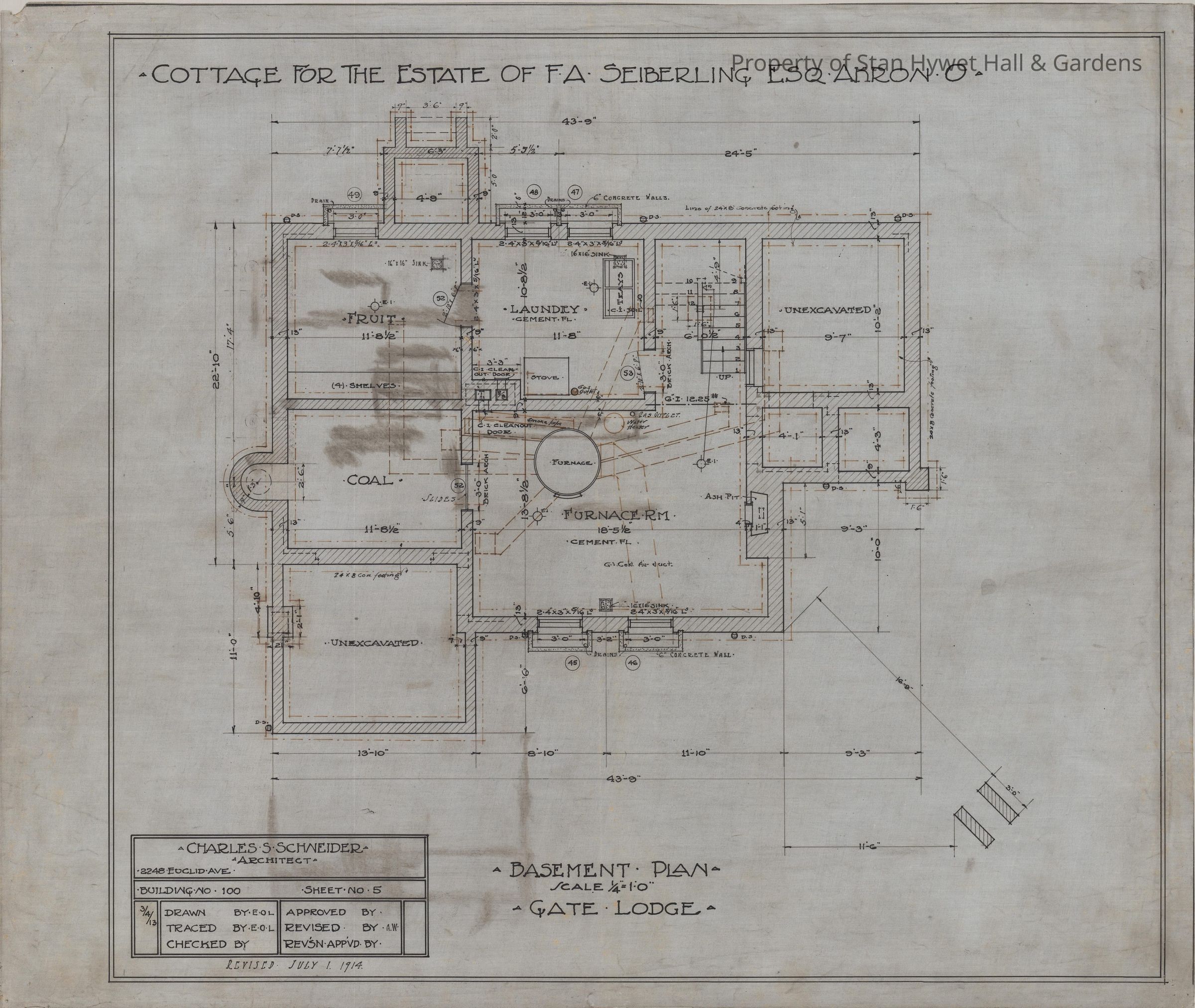 Historic Drawing: Basement plan of Gate Lodge. Titled "Cottage for the Estate of F.A. Seiberling, ESQ, Akron O".