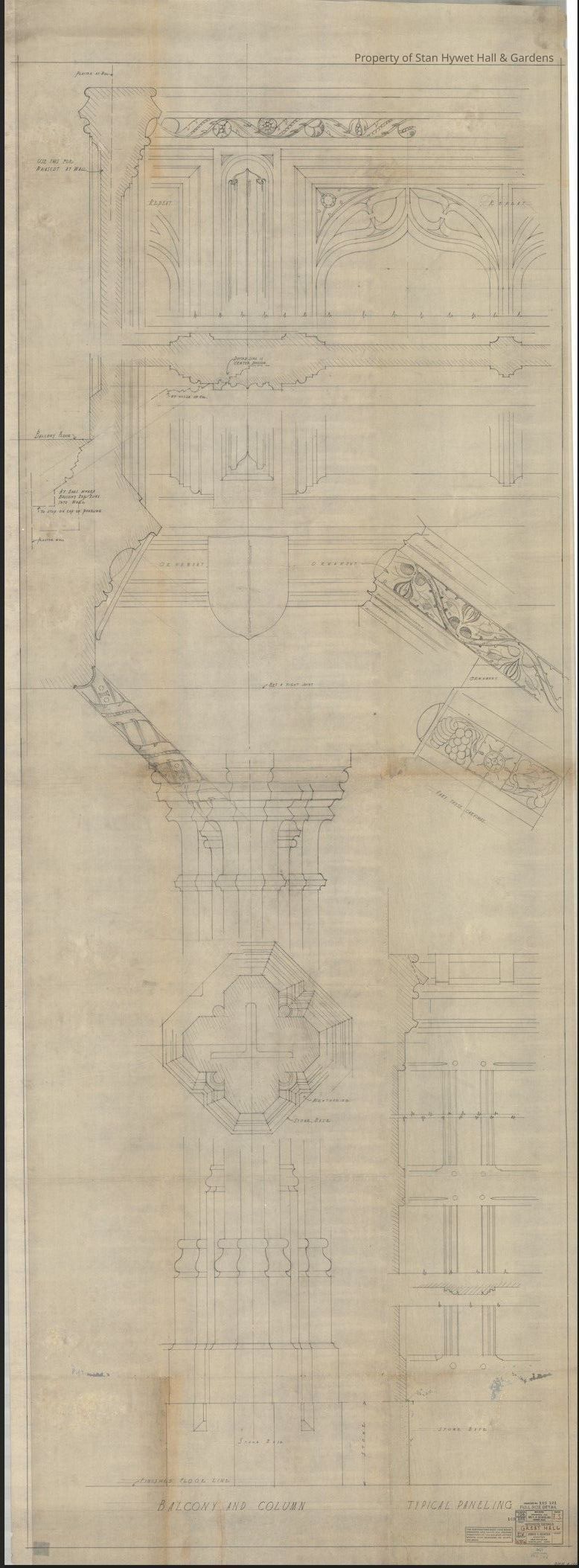 Historic drawing: Full sized woodwork details of Great Hall balcony, paneling, and columns. Titled "Interior Details Great Hall".