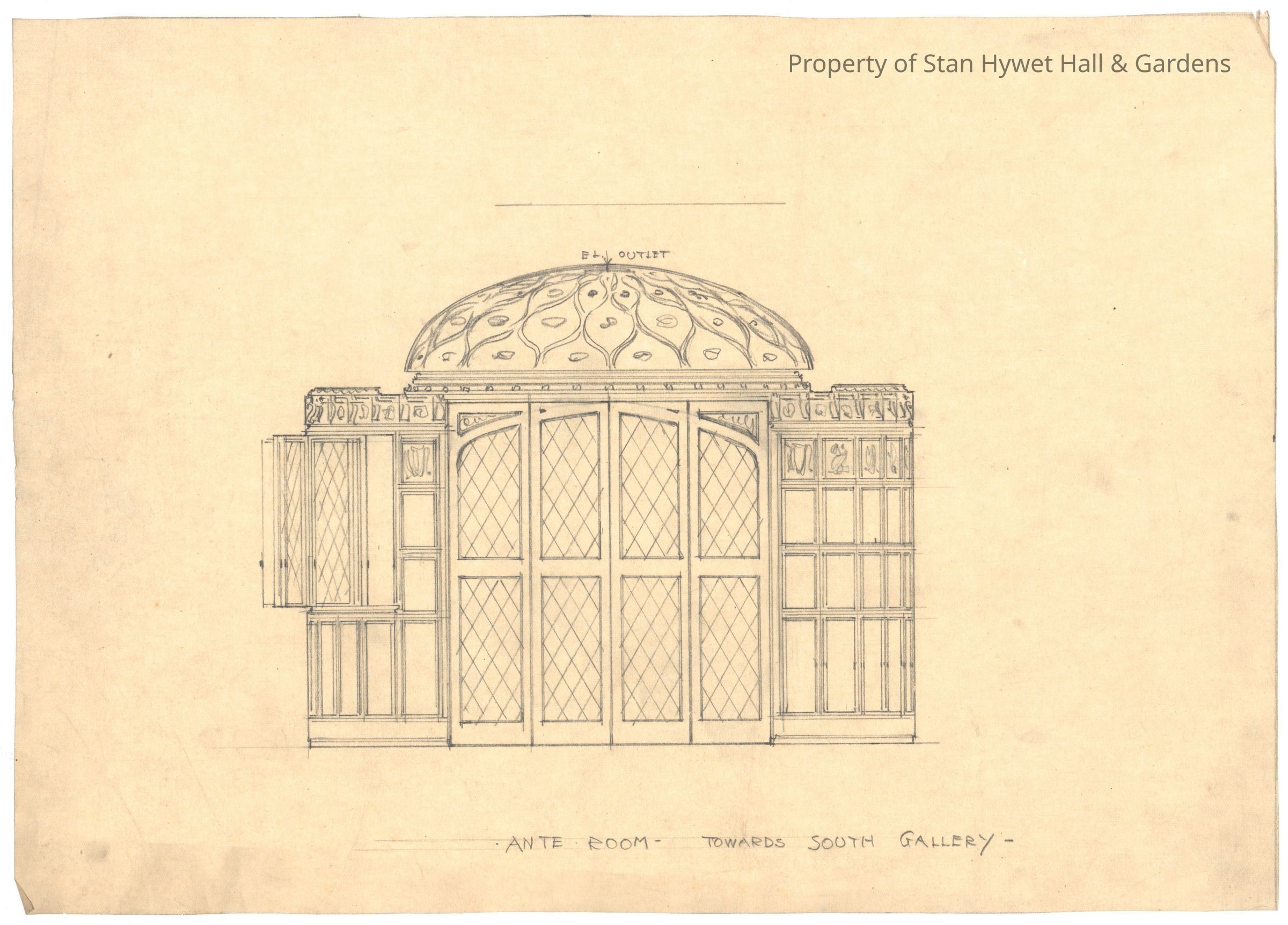 Historic drawing: Detailed drawing north wall of the Round Room, including a concept drawing of the Round Room folding doors. Titled "Ante Room Towards South Gallery".Collection